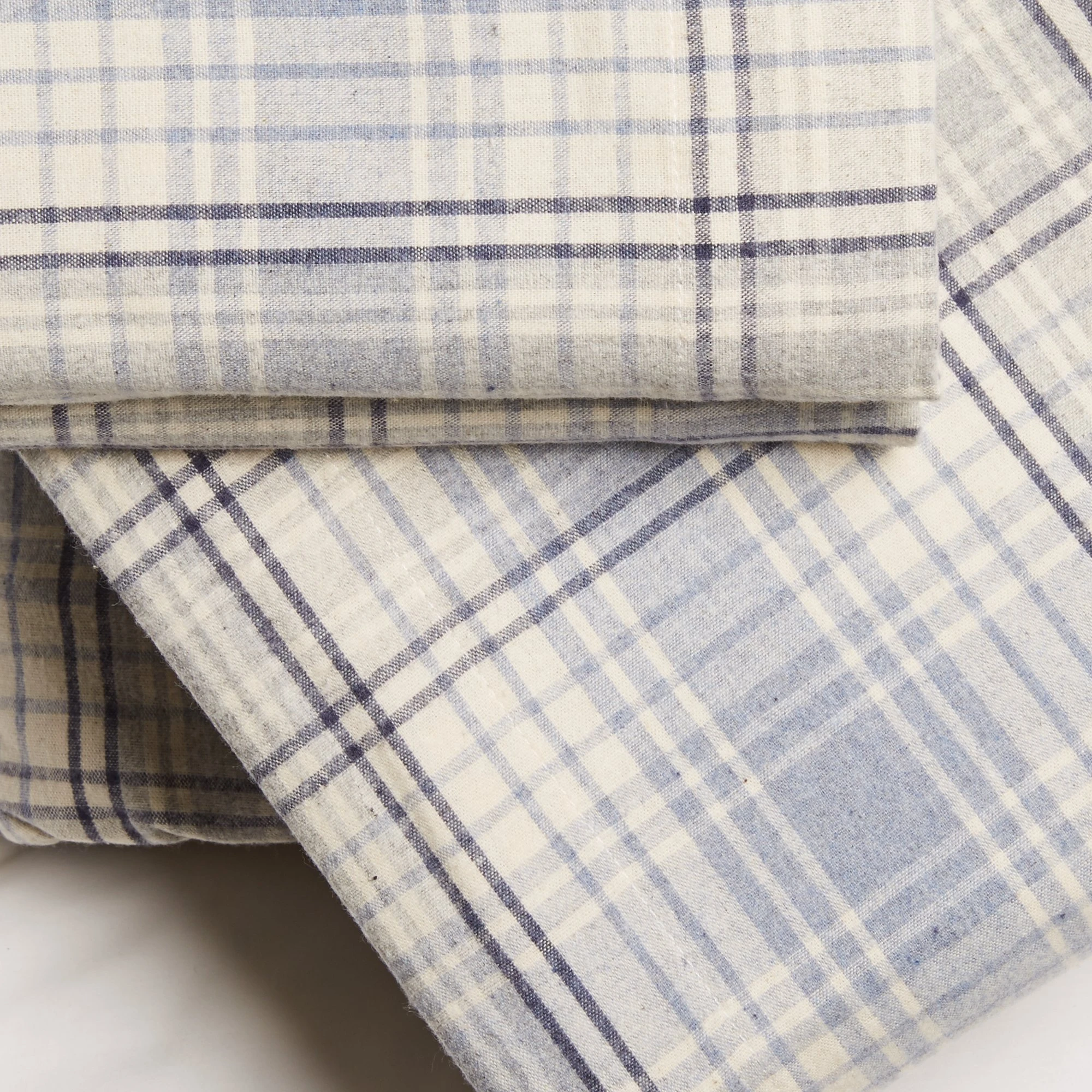 Made from a blend of soft cotton and cotton fibers in a cream-and-blue plaid pattern, this flannel sheet set is ideal for keeping cozy in the colder months. The flannel fabric is brushed four times per side and sulfurized to ensure softness and durability. Fitted sheet fits mattresses up to 18″D.