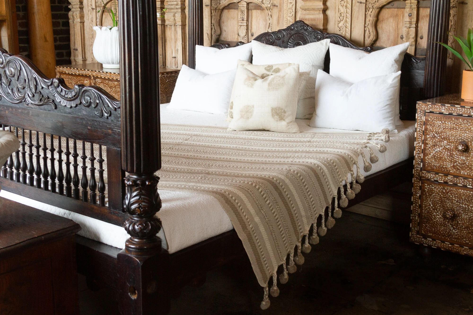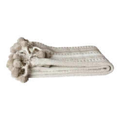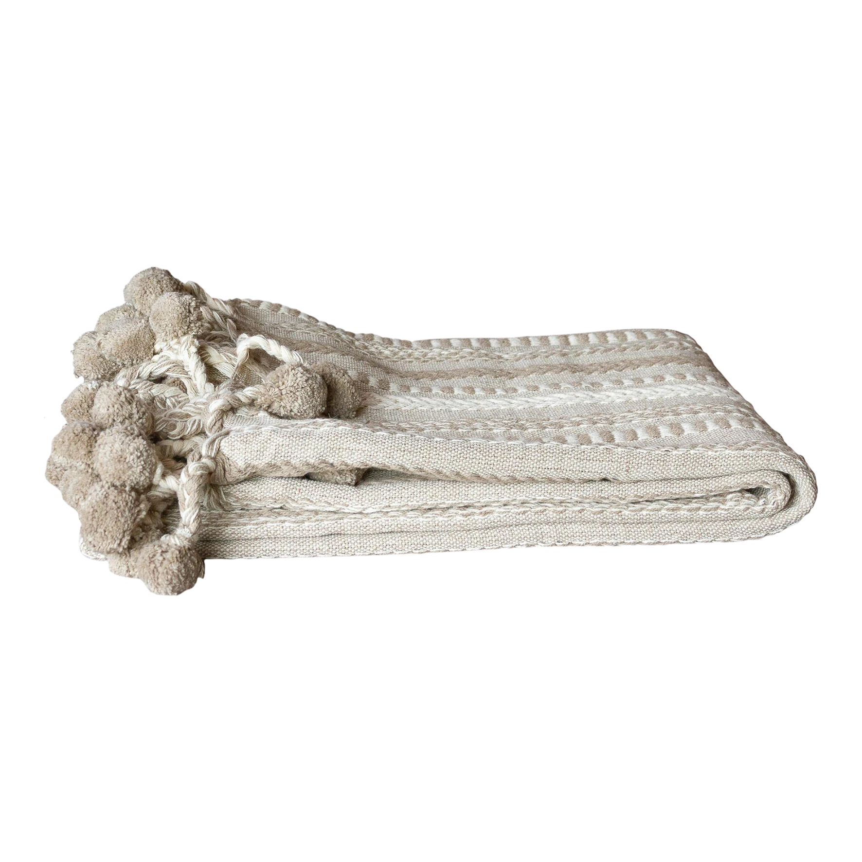 A handloomed cotton throw. Soft in texture, with woven stripes and accented with pom-poms on both ends. Beautiful throw blanket hand woven by artisans in Northeast India.