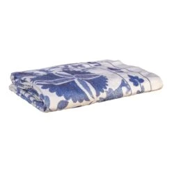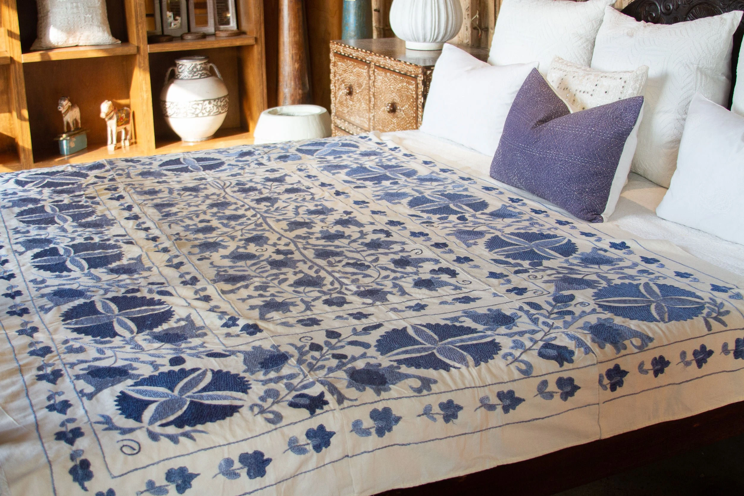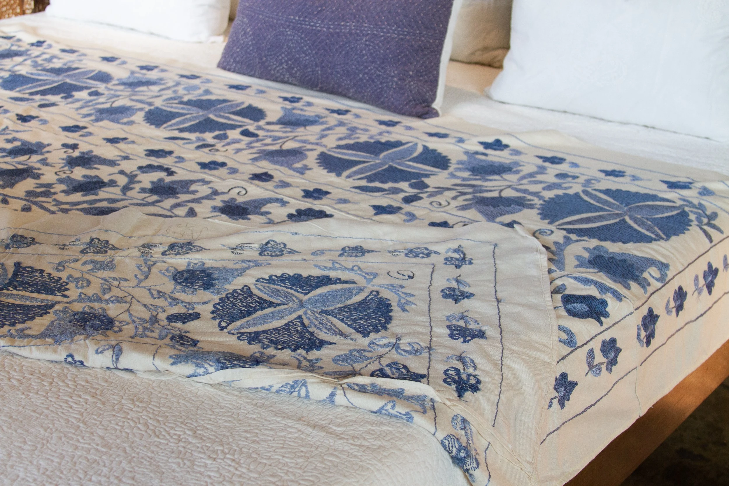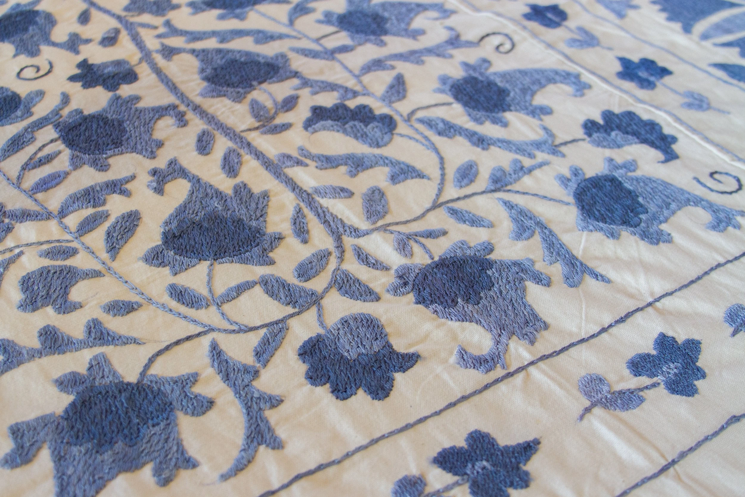 Vintage handcrafted suzani tapestry featuring silk-embroidered blue flowers on cream-hued cotton. Age wear, visible stains.
