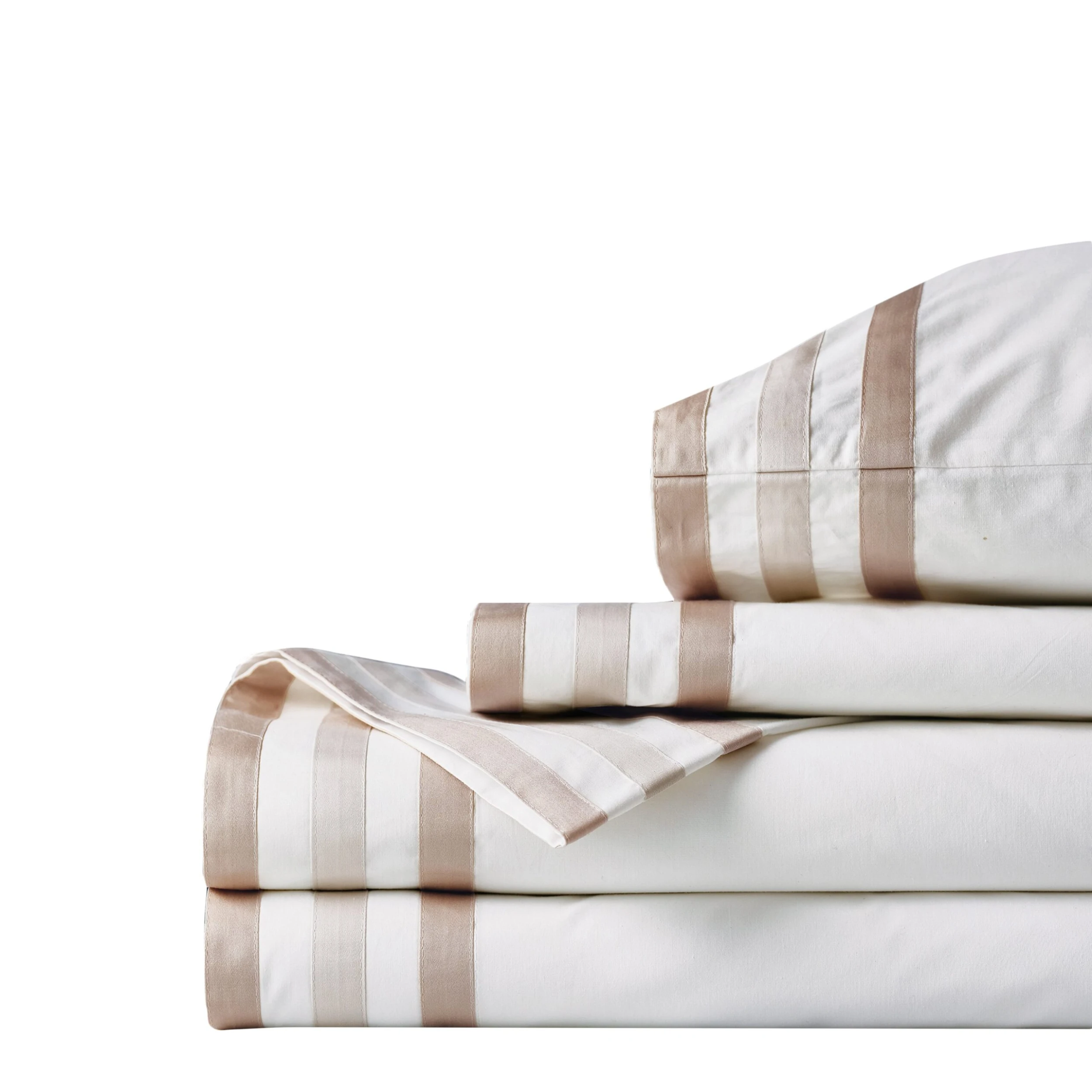 Three rows of ribbon along the four-inch topstitched hems give this sheet set its tailored elegance. The bedding was crafted in the USA of percale woven in Italy from the finest Egyptian cotton. As a result, it offers pampering softness as well as timeless finesse. The fitted sheet has a 17-inch pocket to accommodate even extra-thick mattresses.