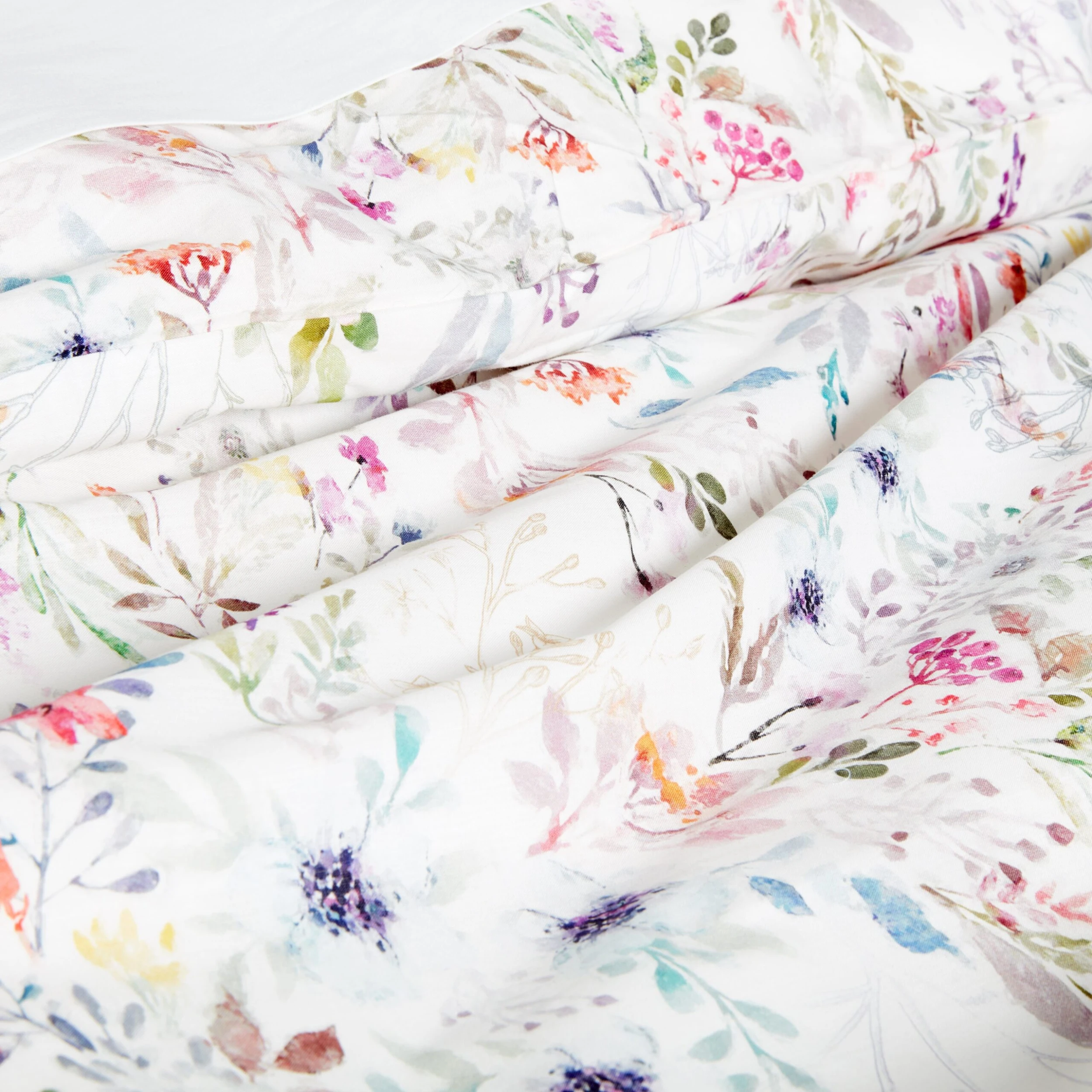 An enchanting wildflower print lends bright splashes of color and fanciful allure to this luxe cotton percale duvet cover. The duvet’s edges are beautifully accented by an overlock-stitch detail in platinum thread.