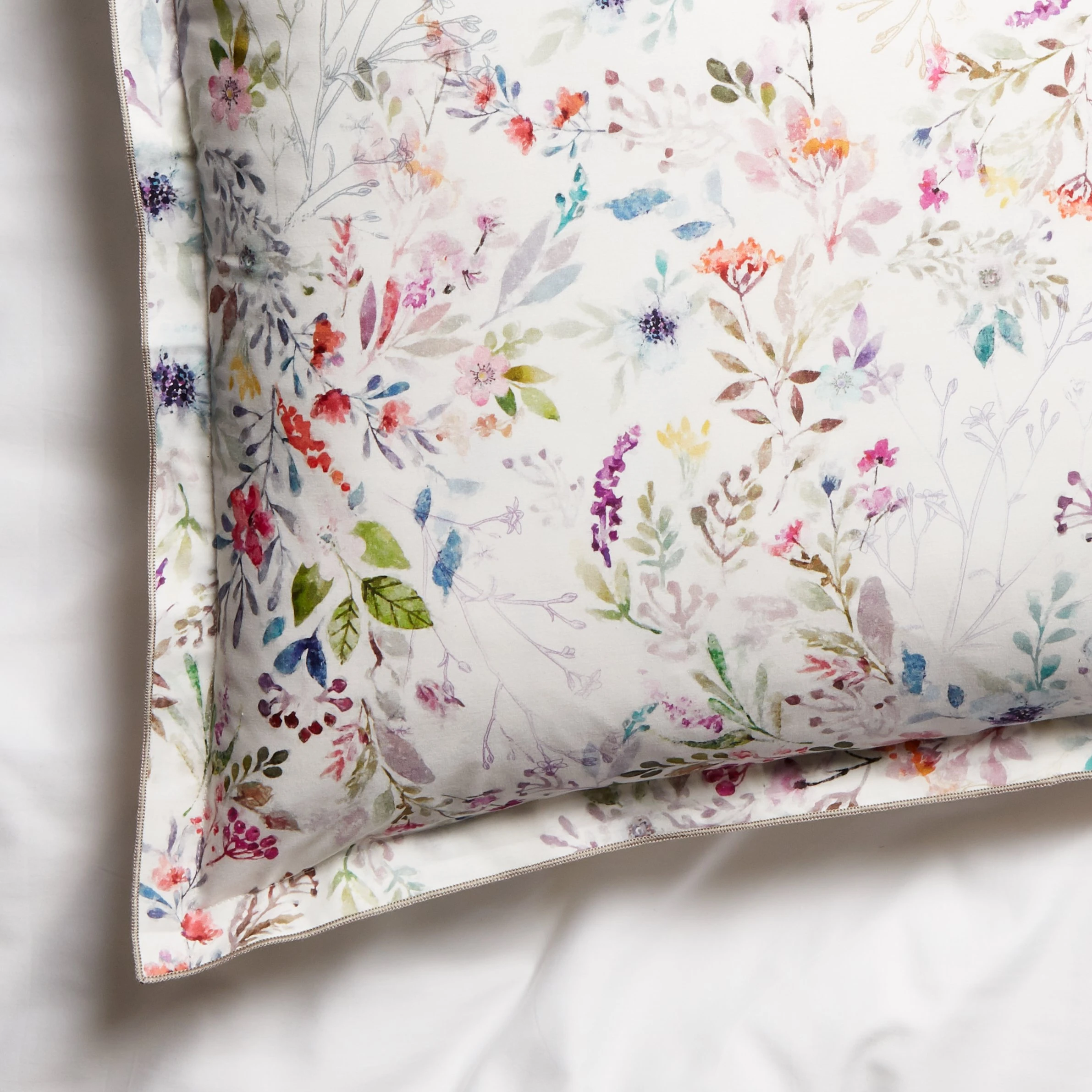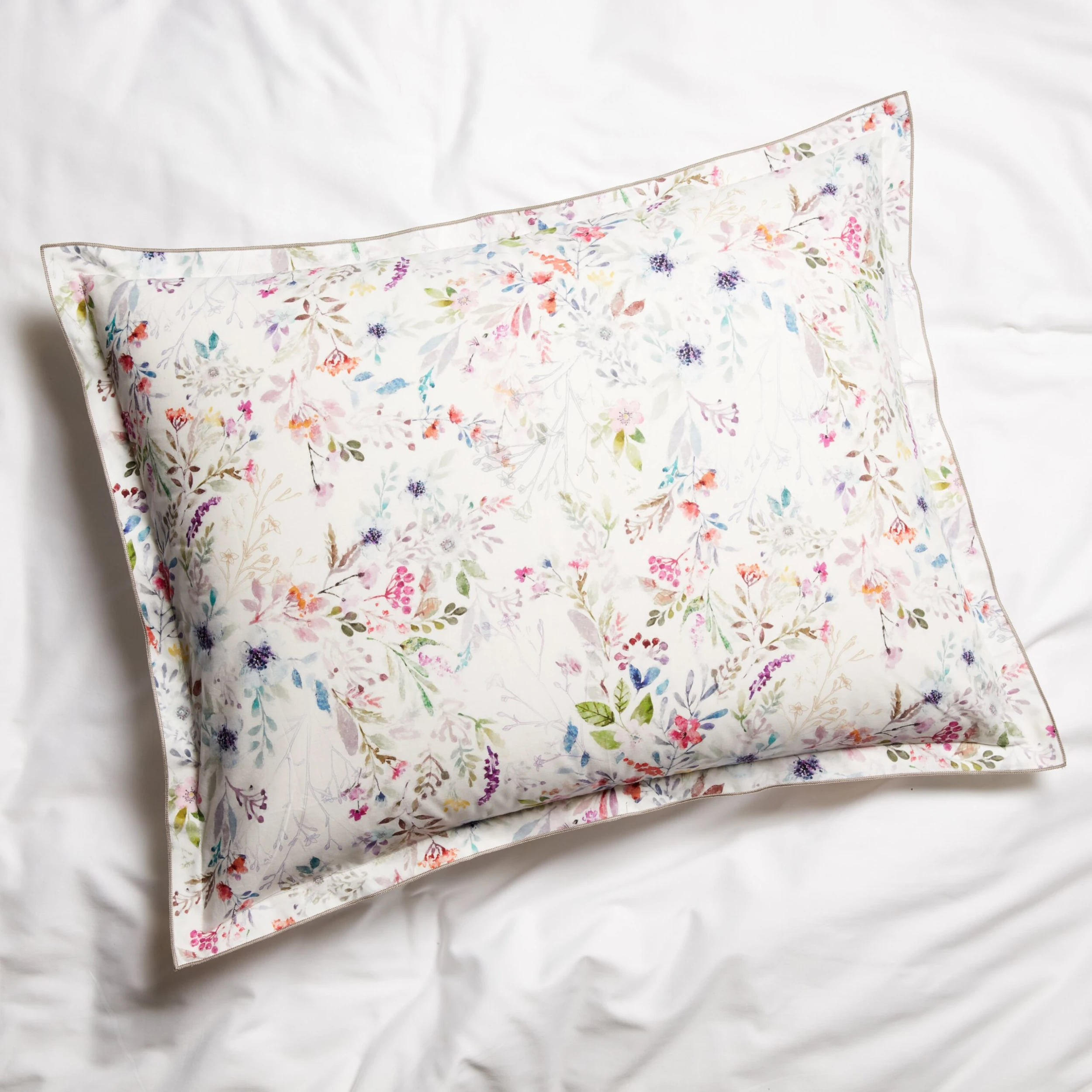 An enchanting wildflower print lends bright splashes of color and fanciful allure to this luxe cotton percale sham. The flange is accented by an overlock-stitch detail in platinum thread.