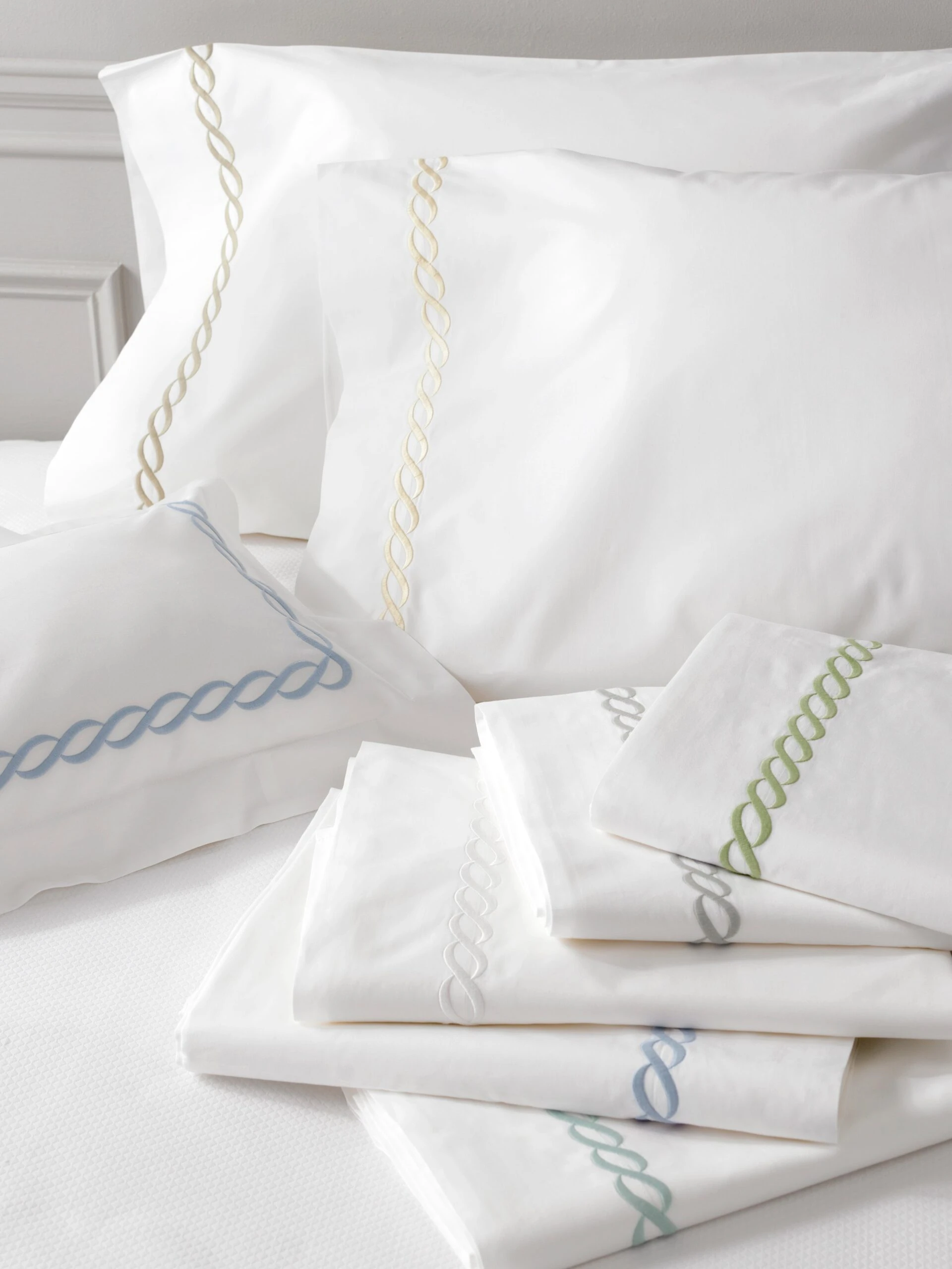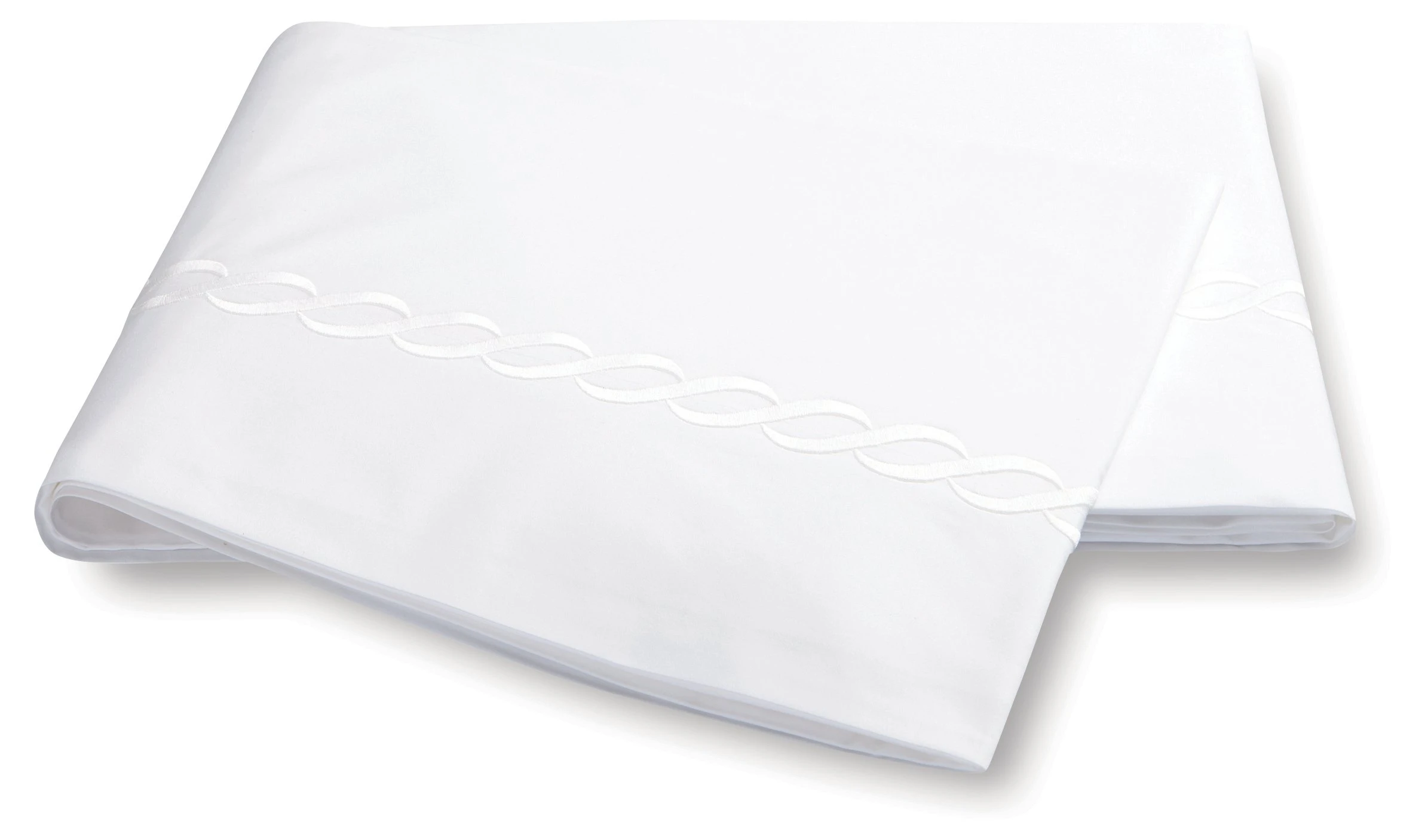 An embroidered chain motif accents this crisp, cotton percale flat sheet with traditional flair. All Matouk fabrics are OEKO-TEX Standard 100 certified, meaning they are safe for you and for the planet.