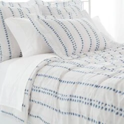 Navy-blue stripes are stitched onto the white ground of this handwoven cotton throw. Six-inch-long braided fringe adds to the artisanal allure.