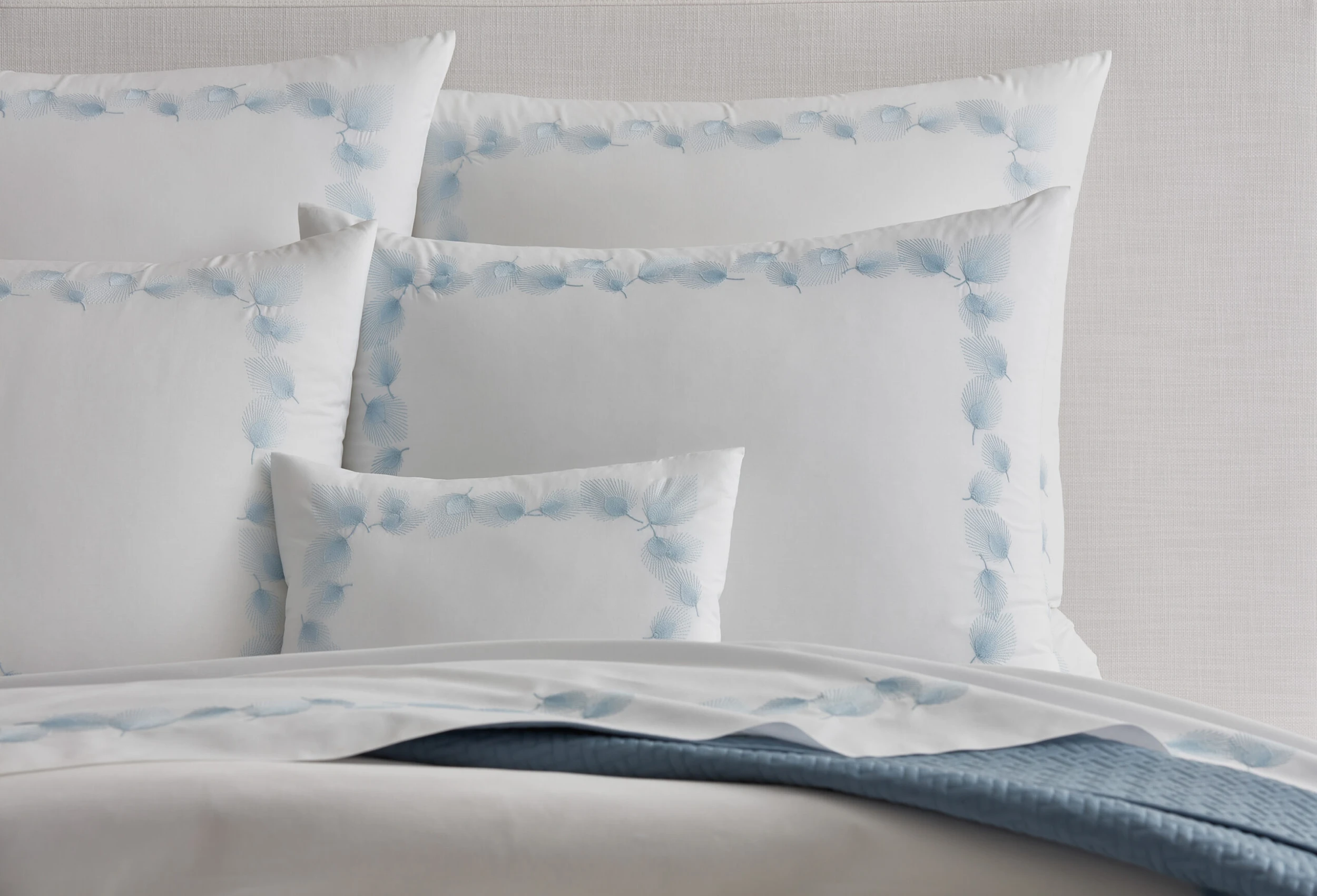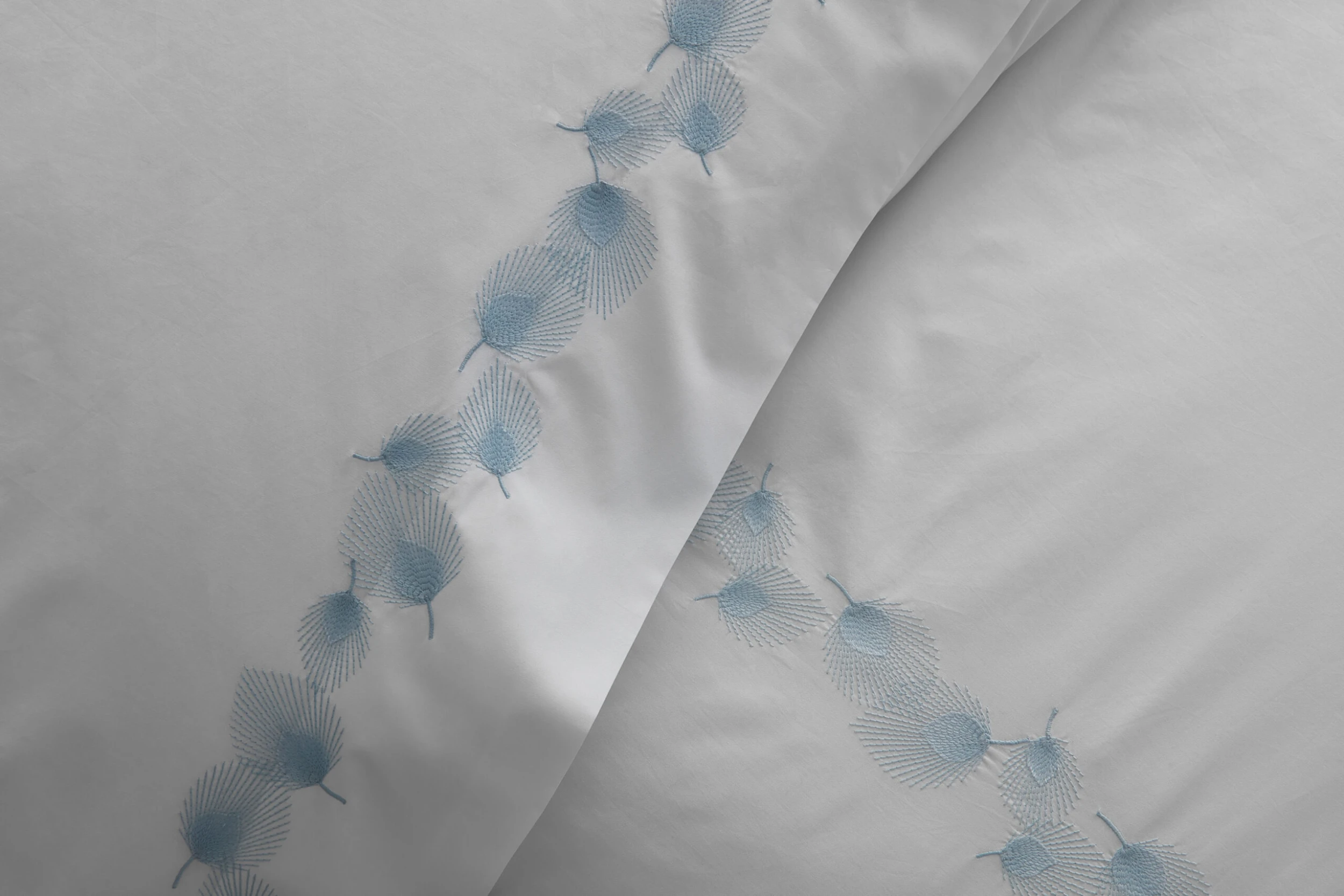 Appliqué and embroidery techniques create the delicate tumbling feathers that adorn this flat sheet. The snow-white fabric is made of extra-long-staple Egyptian cotton with a 1,000-thread count for the ultimate in sumptuous comfort.