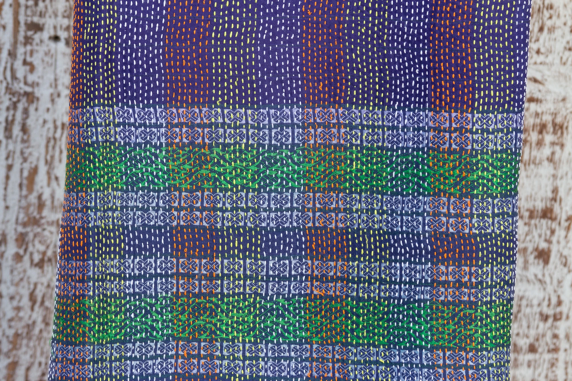 The eye-catching Silk Kantha Scarf features ornate patterns and the characteristic running stitch, giving it an exuberant look and striking details. With vintage silk and hand-done stitching, each Kantha has a unique touch and is one-of-a-kind.