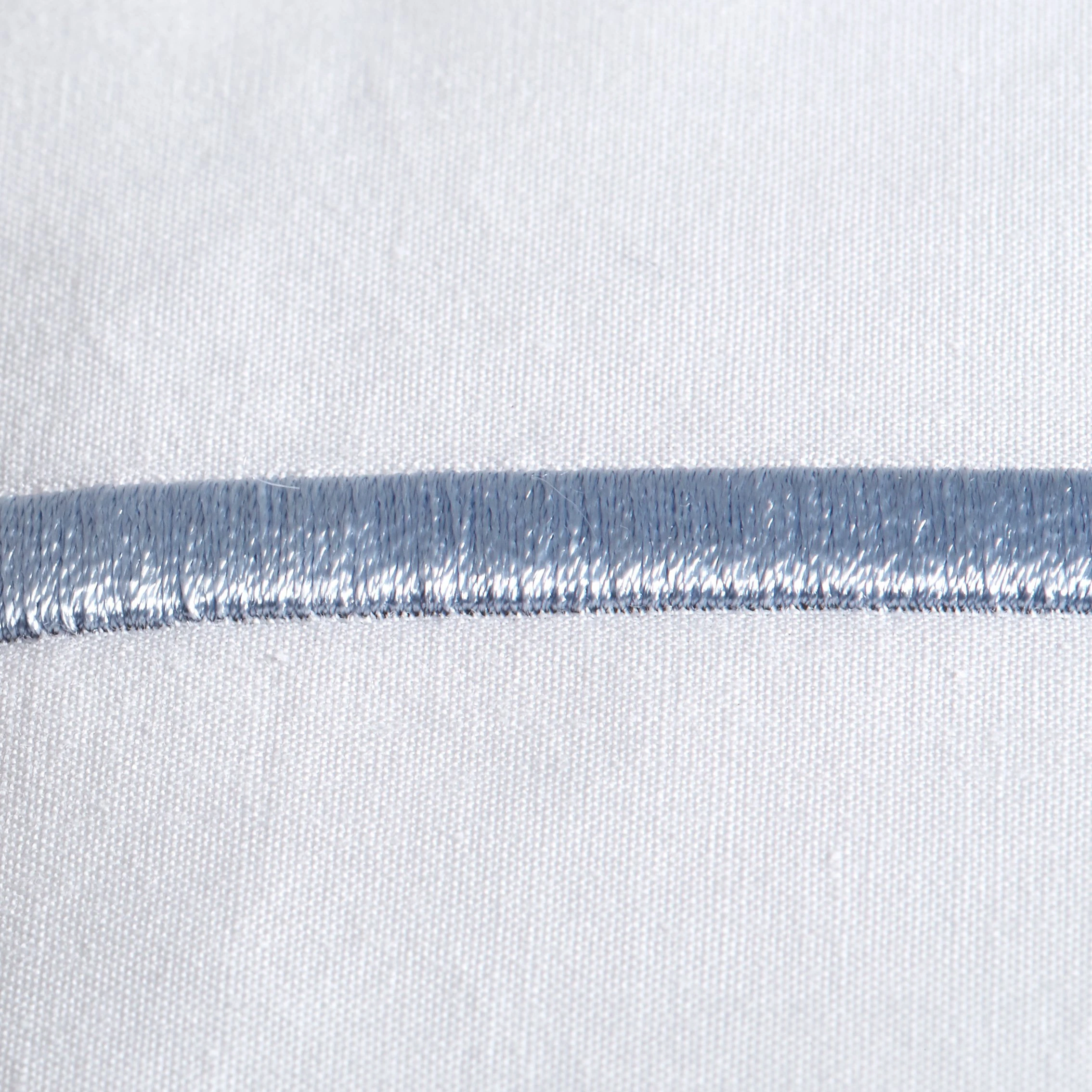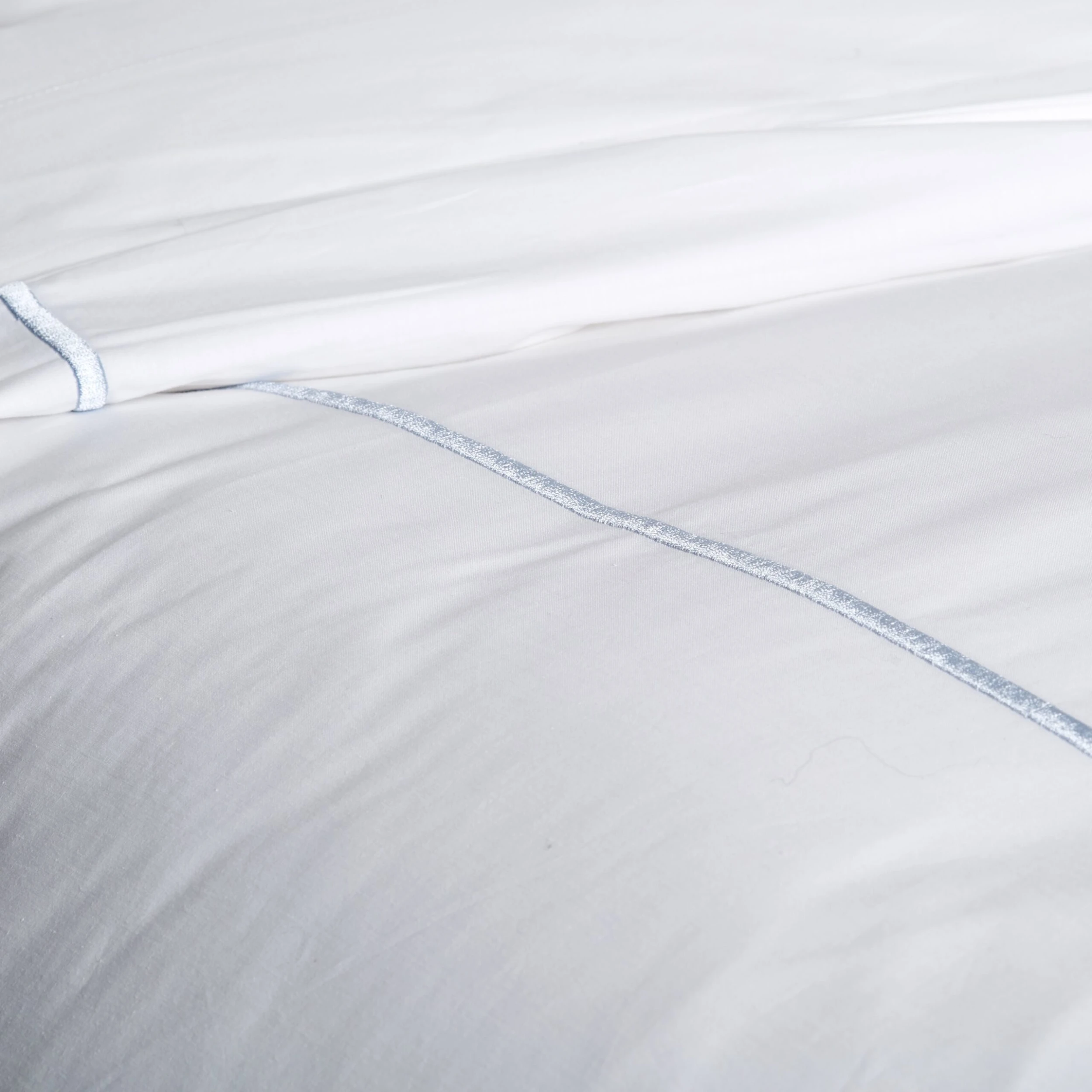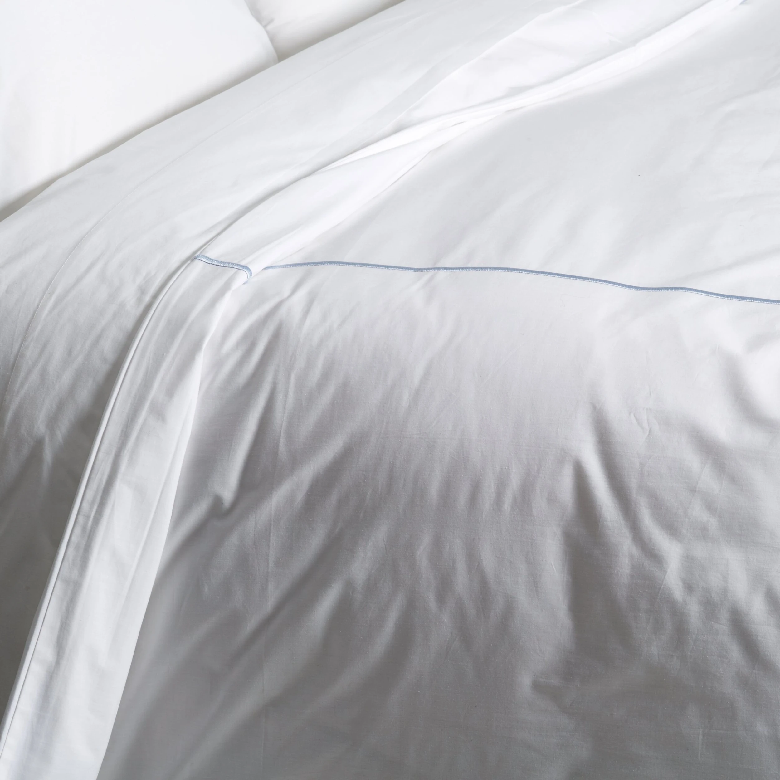 Exclusive to One Kings Lane: This exquisite duvet cover is made from the finest Pima cotton percale, woven in Italy and artfully embroidered in the USA with light blue fretwork details.