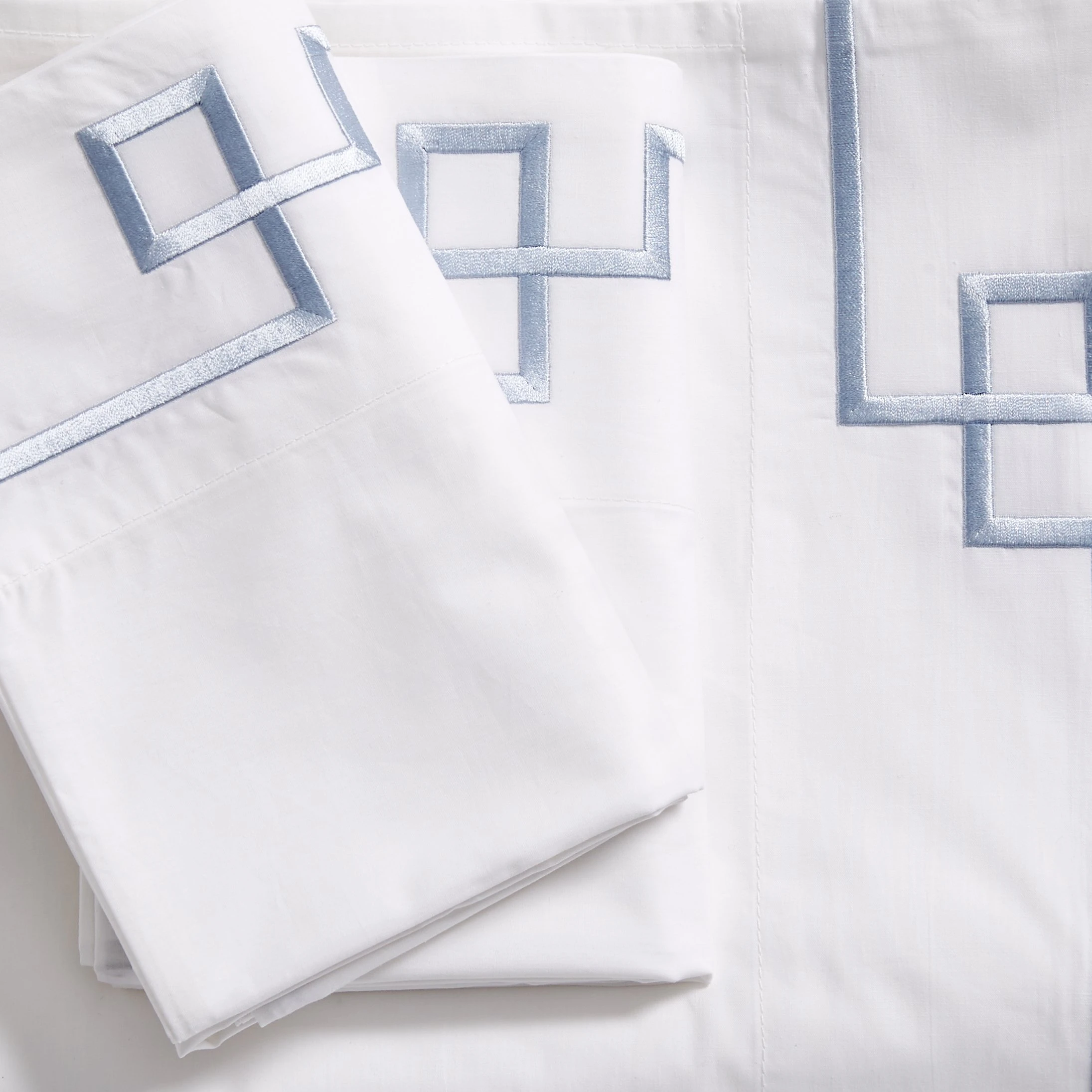 Exclusive to One Kings Lane: Intricately embroidered with fretwork details in light blue, this exquisite sheet set is made from the finest Pima cotton percale, woven in Italy and artfully embroidered in the USA.