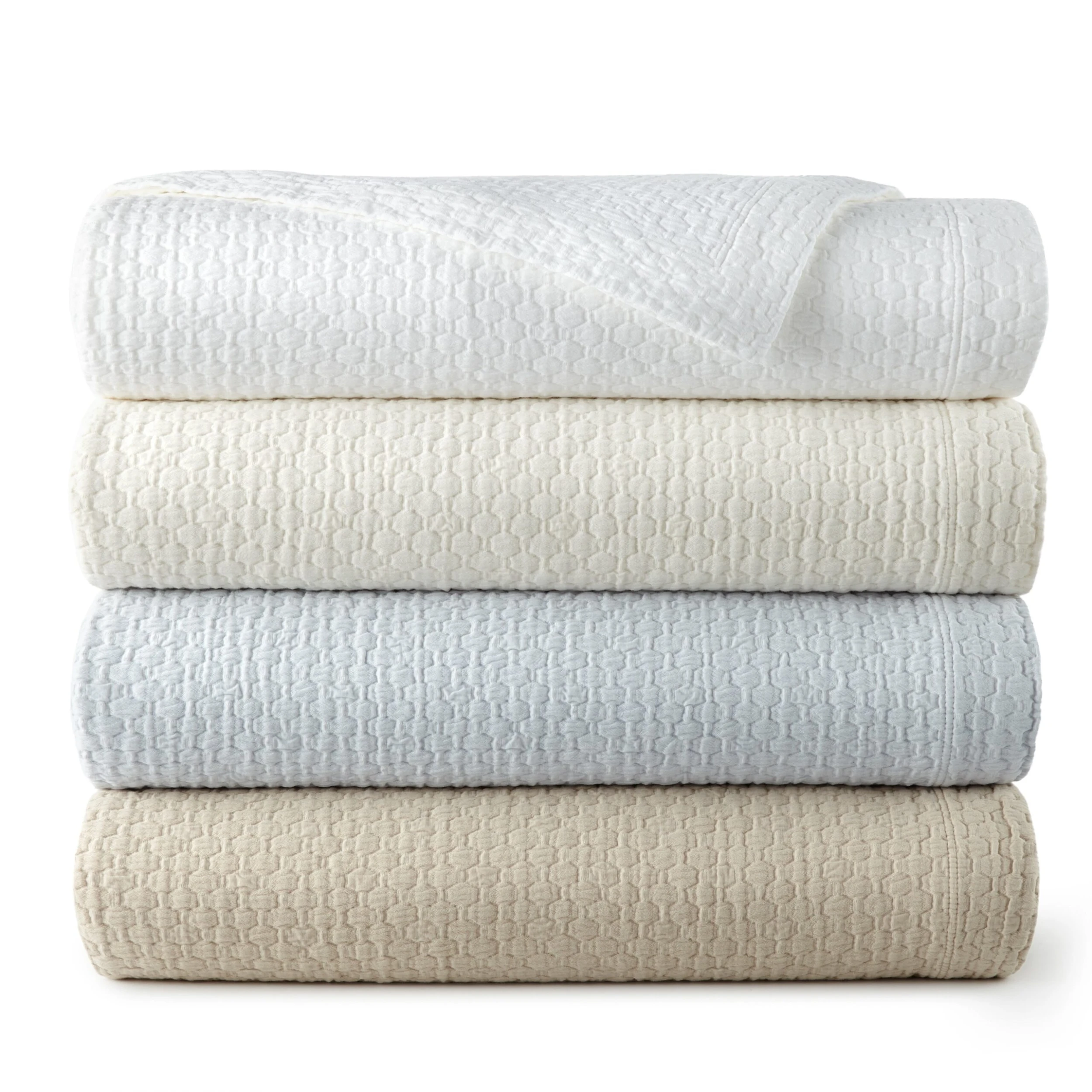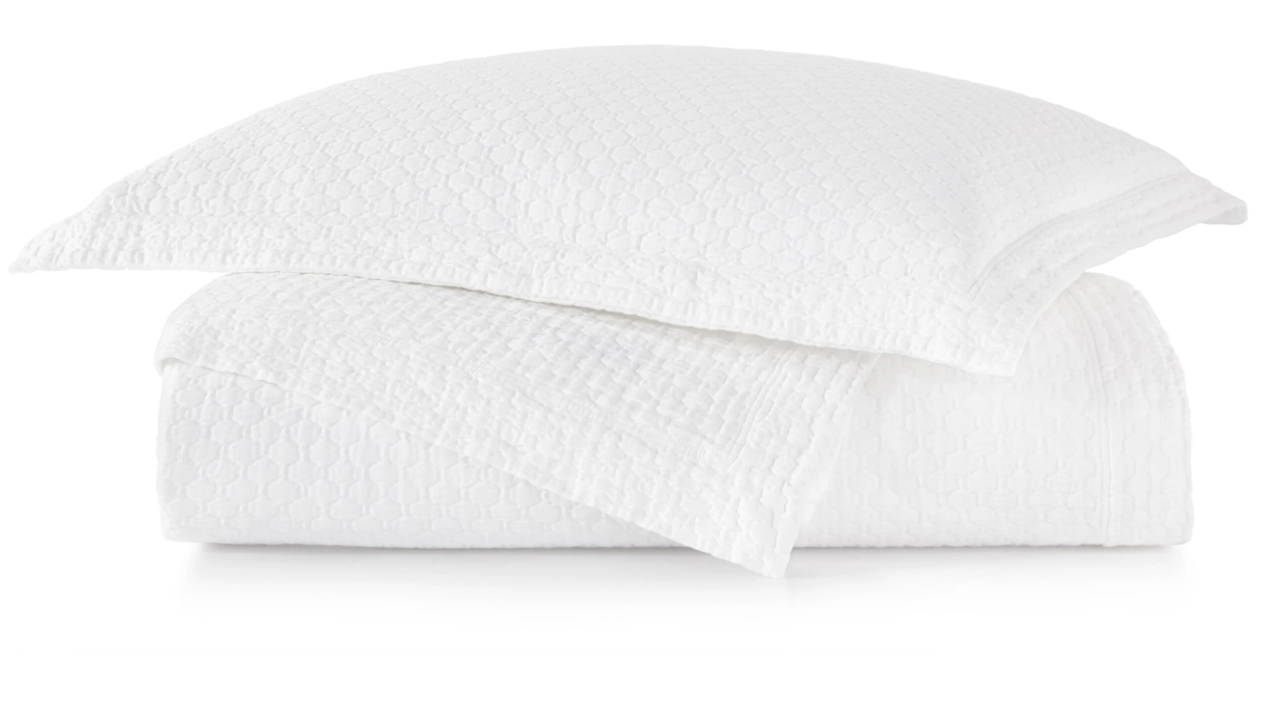The basket-weave matelassé stitching adds to the luxuriousness of this cotton coverlet, while the two-inch flange on three sides adds to the elegance. The top has a one-inch hem.