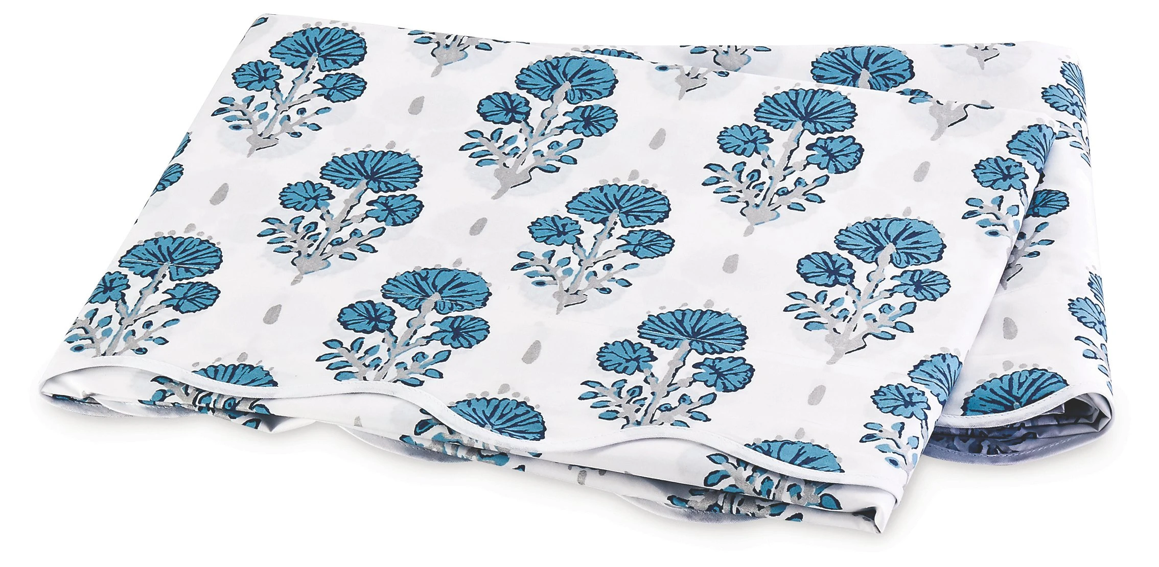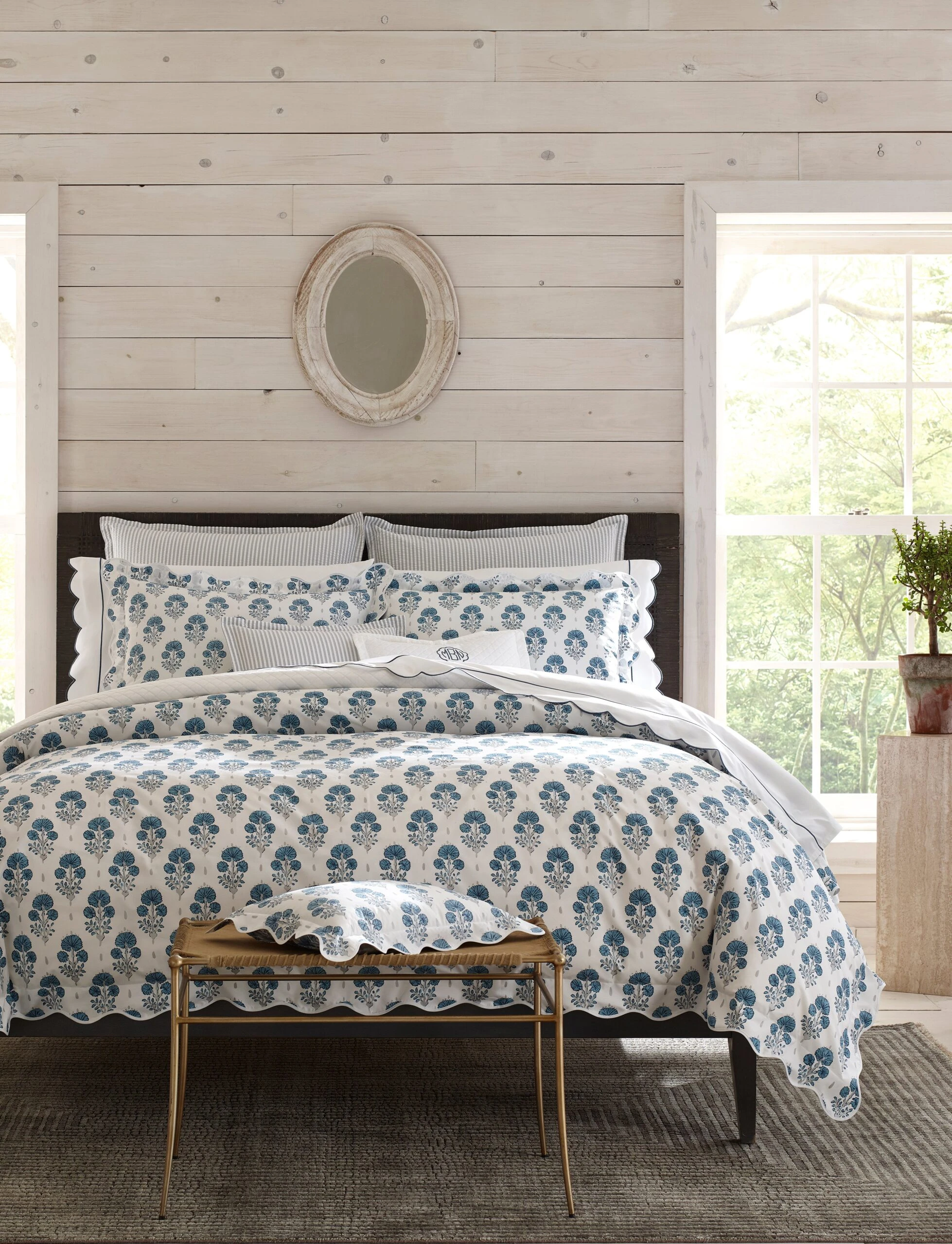 The oversize floral print by Lulu DK and the scalloped edges give this flat sheet its sunny charm; the 500-count Egyptian cotton percale ensures luxurious comfort. Made in the USA of Italian material.