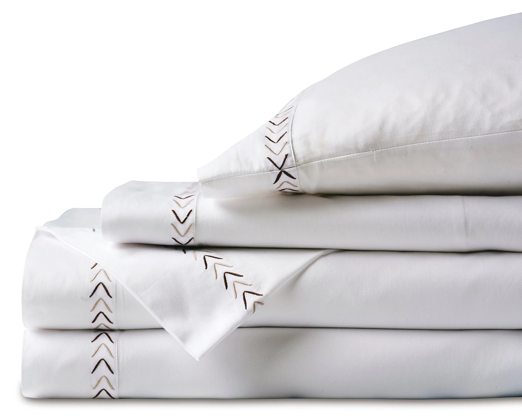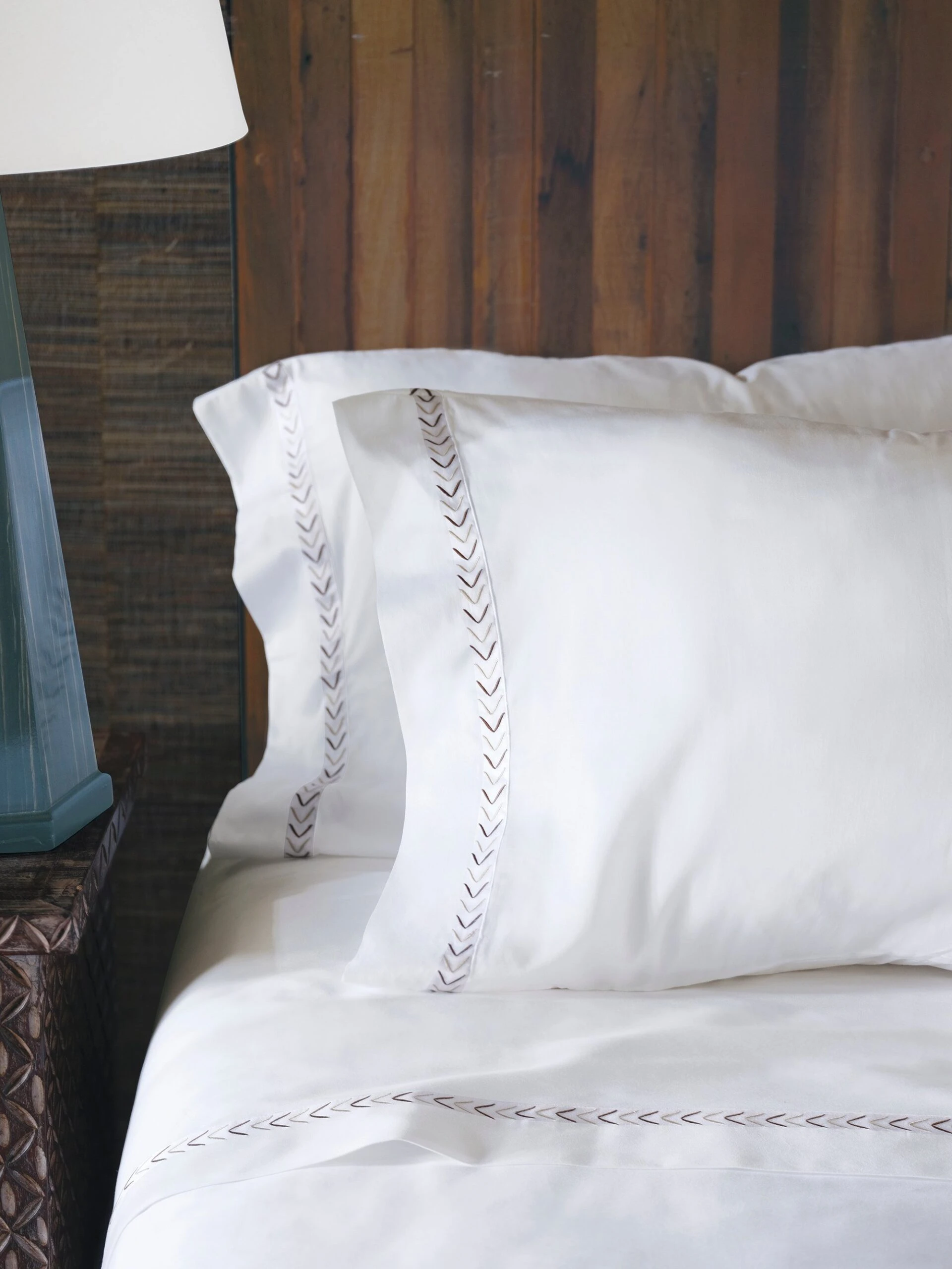 Woven in Italy of fine Egyptian cotton sateen, this silky-soft sheet set is finished with neutral-hued embroidery on the hems of the flat sheet and pillowcases. The fitted sheet has a 17″ gusset.