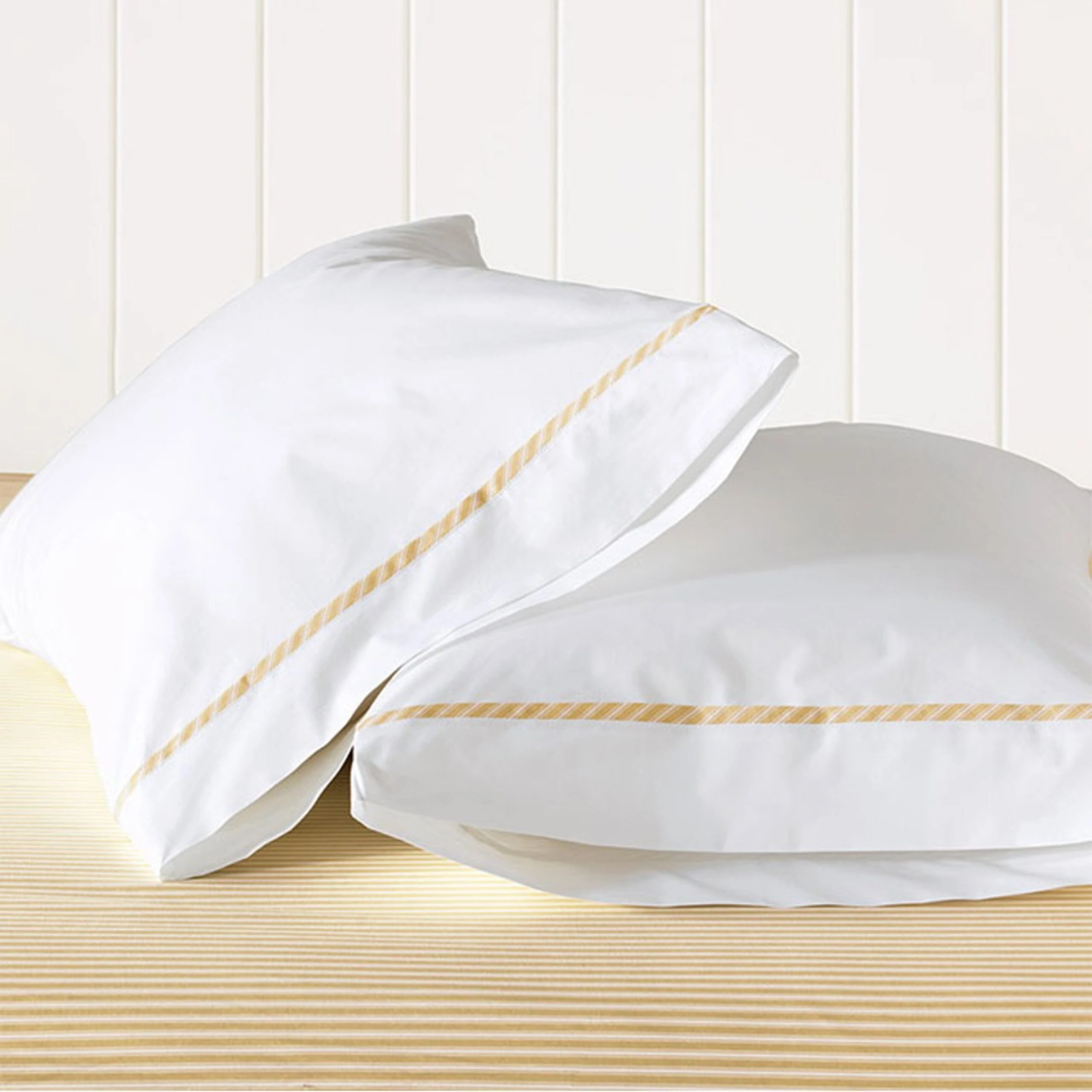 Striped ribbon along the hems gives this sheet set a quiet but unmistakable elegance. Made of Egyptian cotton percale, it offers pampering softness as well as tailored finesse. The fitted sheet has a 17-inch pocket to accommodate even extra-thick mattresses.