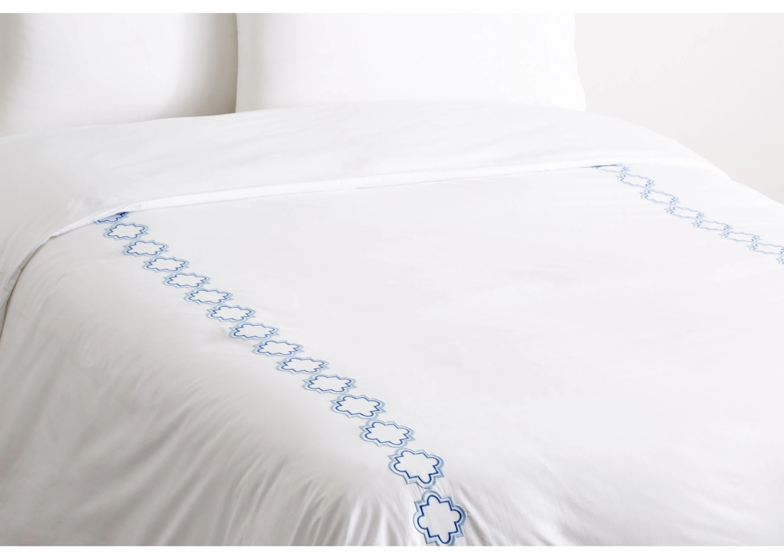 This exquisite Egyptian cotton duvet cover, offered exclusively through One Kings Lane, is made from the finest Italian percale and embroidered in the USA with an elegant, two-tone quatrefoil design.