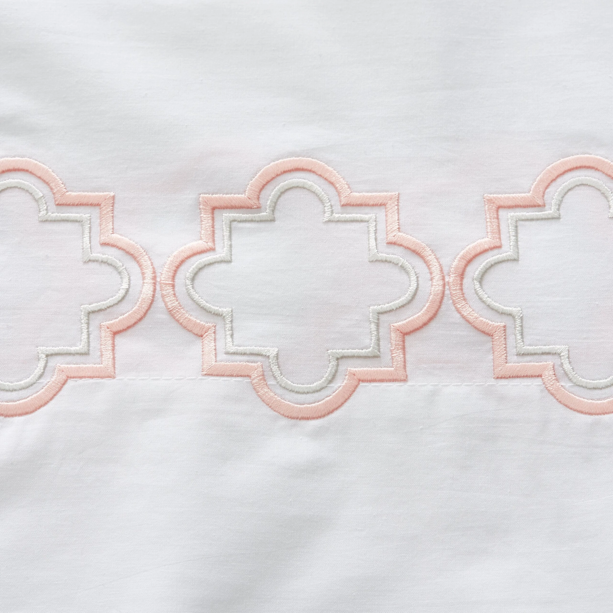 Exclusive to One Kings Lane: These exquisite pillowcases are made from the finest Italian percale and embroidered in the USA with an elegant, two-tone quatrefoil design. We love how the pink embroidery adds a subtle pop of color to the all-white design.