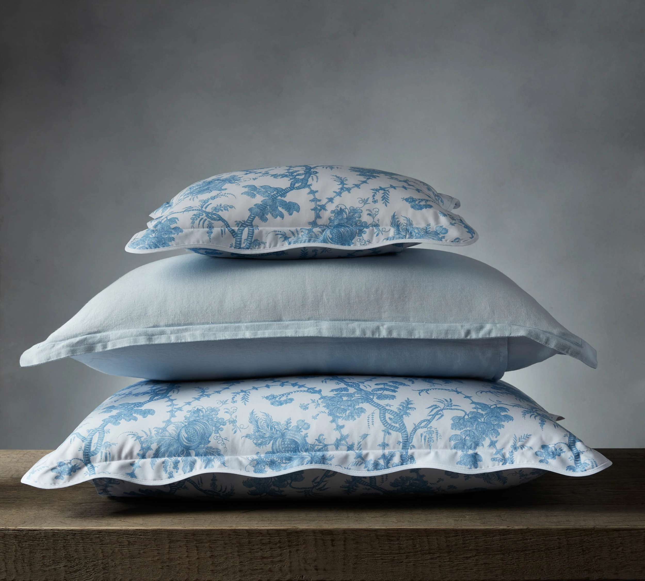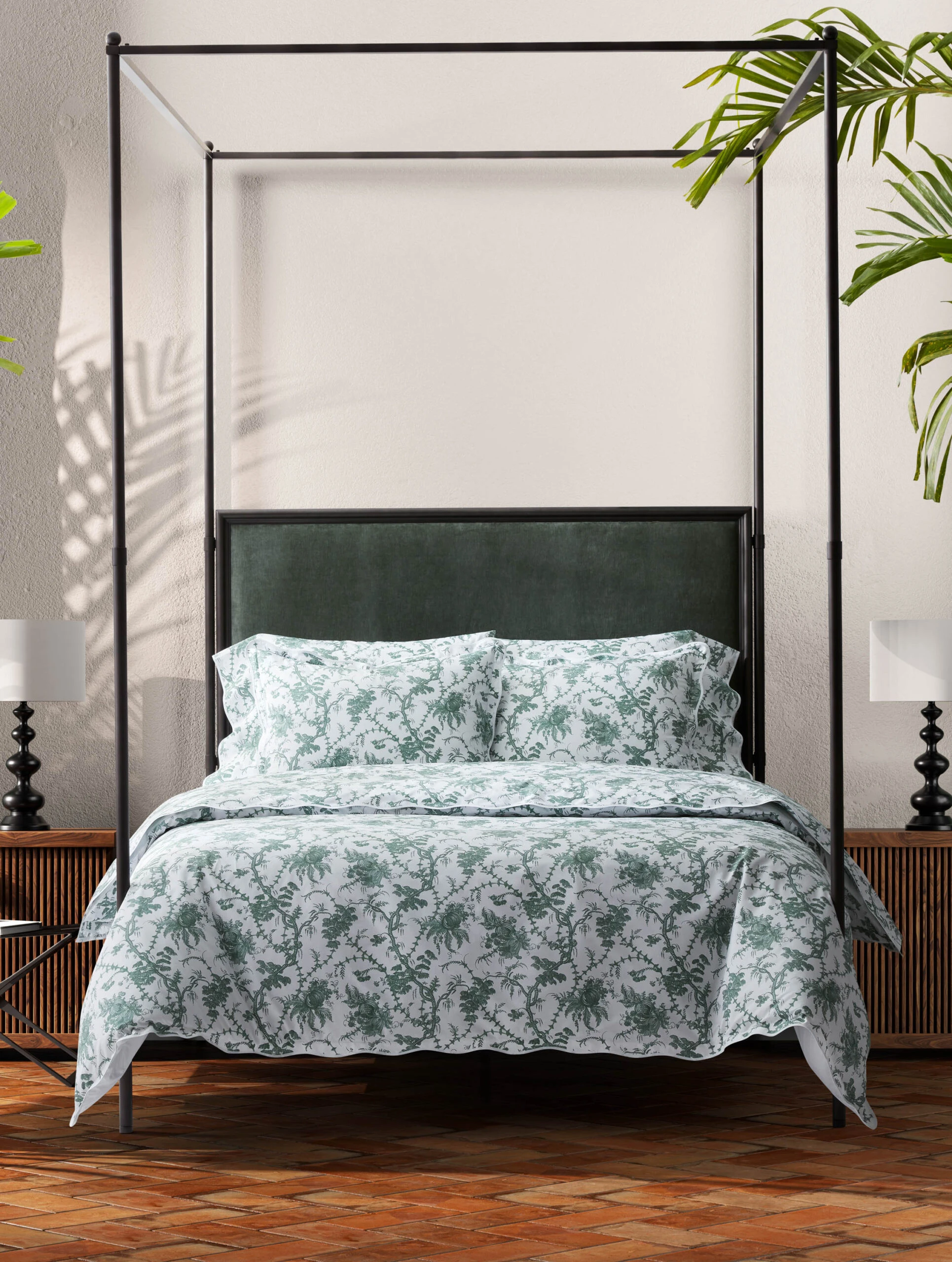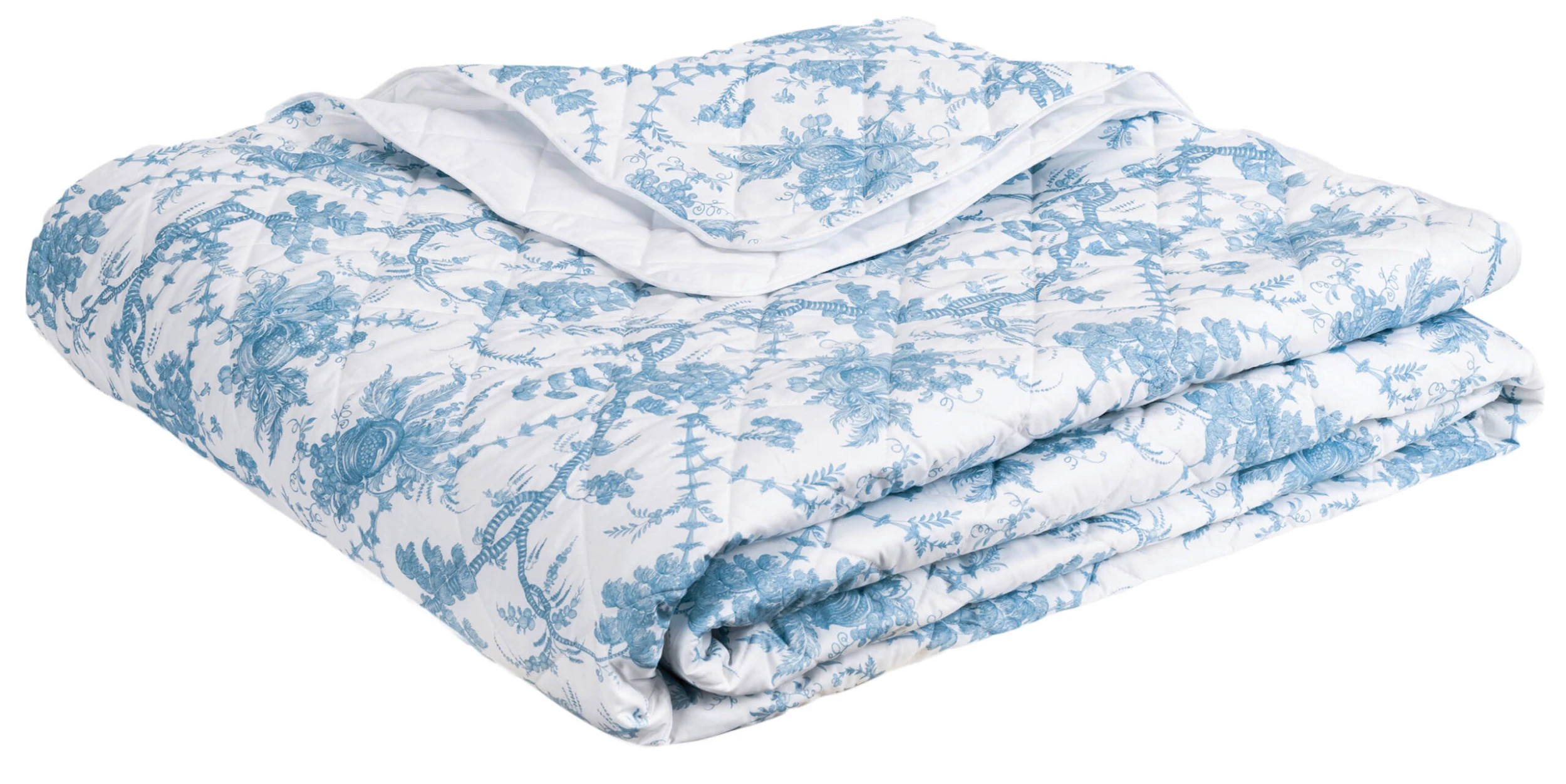 Schumacher’s San Cristobal print is a faithful rendition of an elaborately detailed 18th-century toile. Here it’s replicated on Egyptian cotton percale with an impressive 500-thread count, which ensures that this quilt feels as luxurious as it looks. The graceful scalloped and taped edges add to the overall elegance. All Matouk fabrics are OEKO-TEX Standard 100 certified, meaning they are safe for you and for the planet.Â