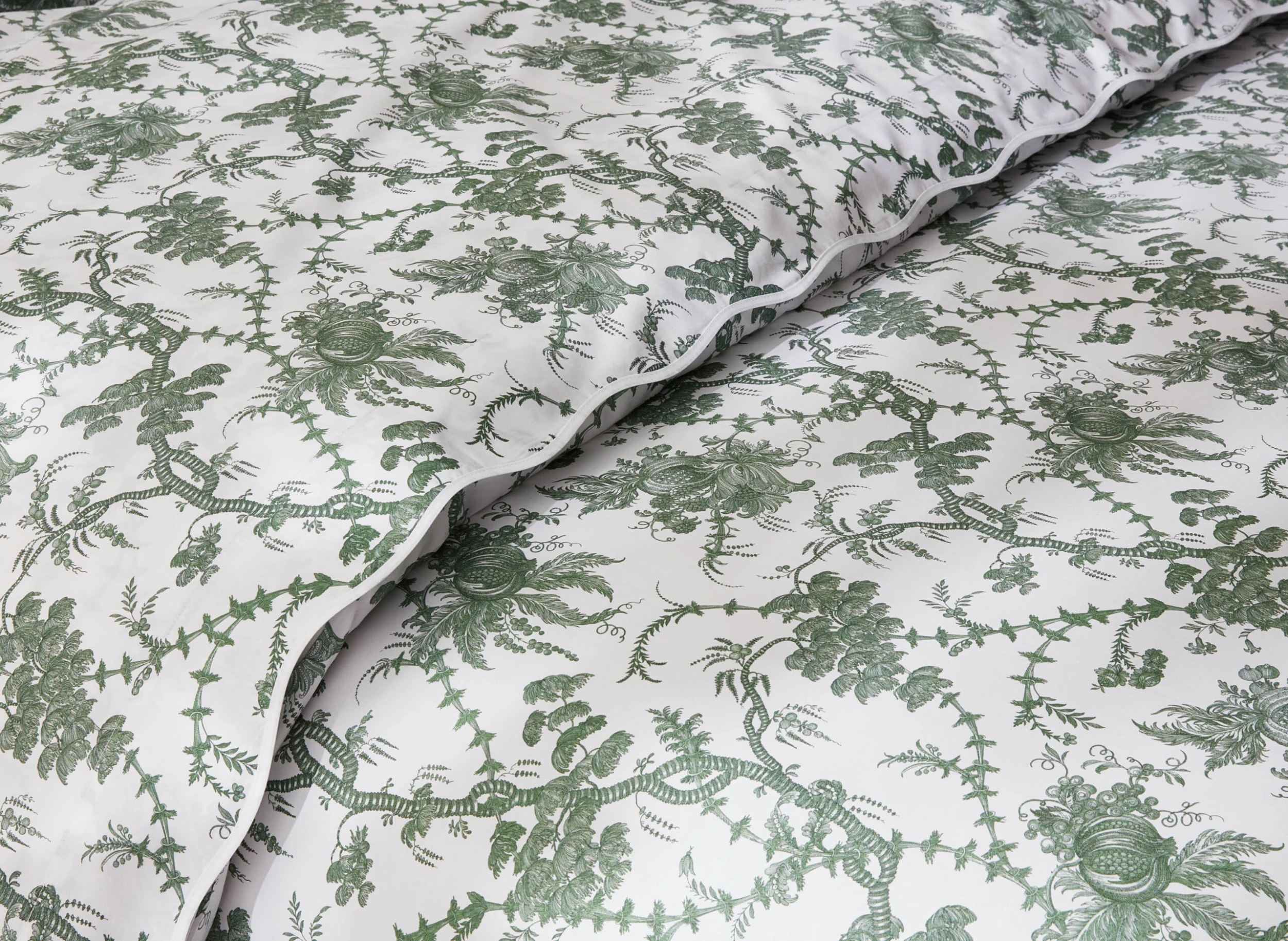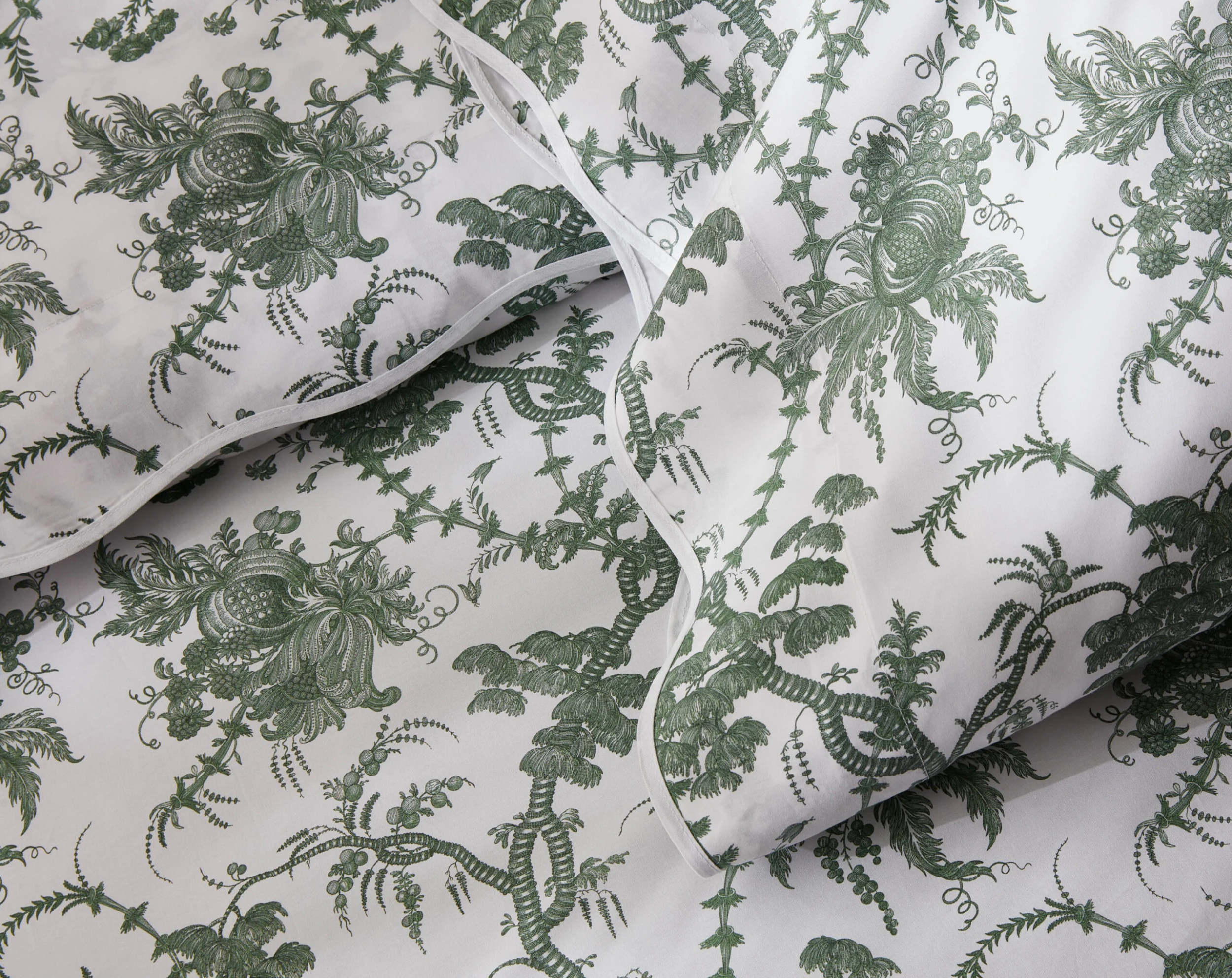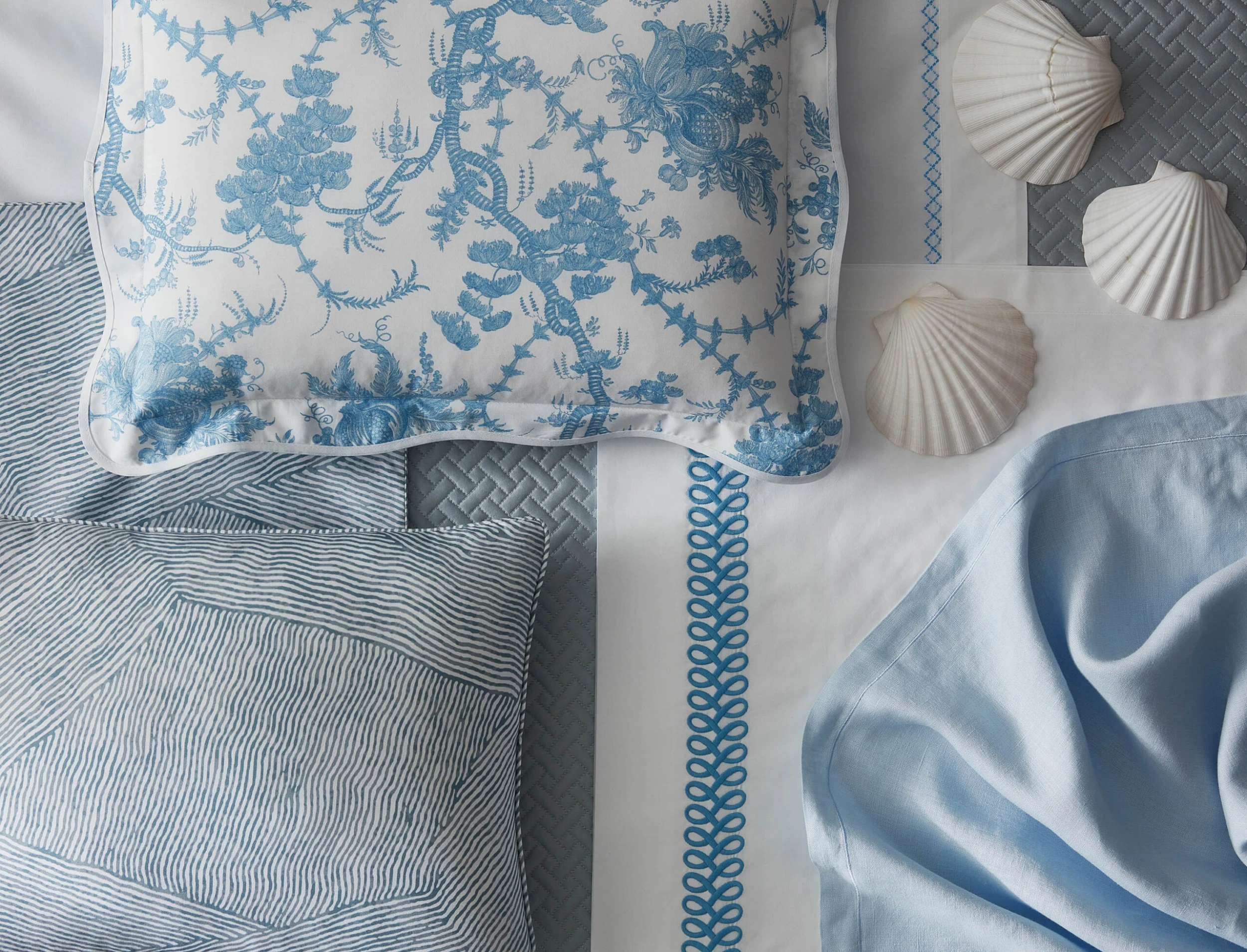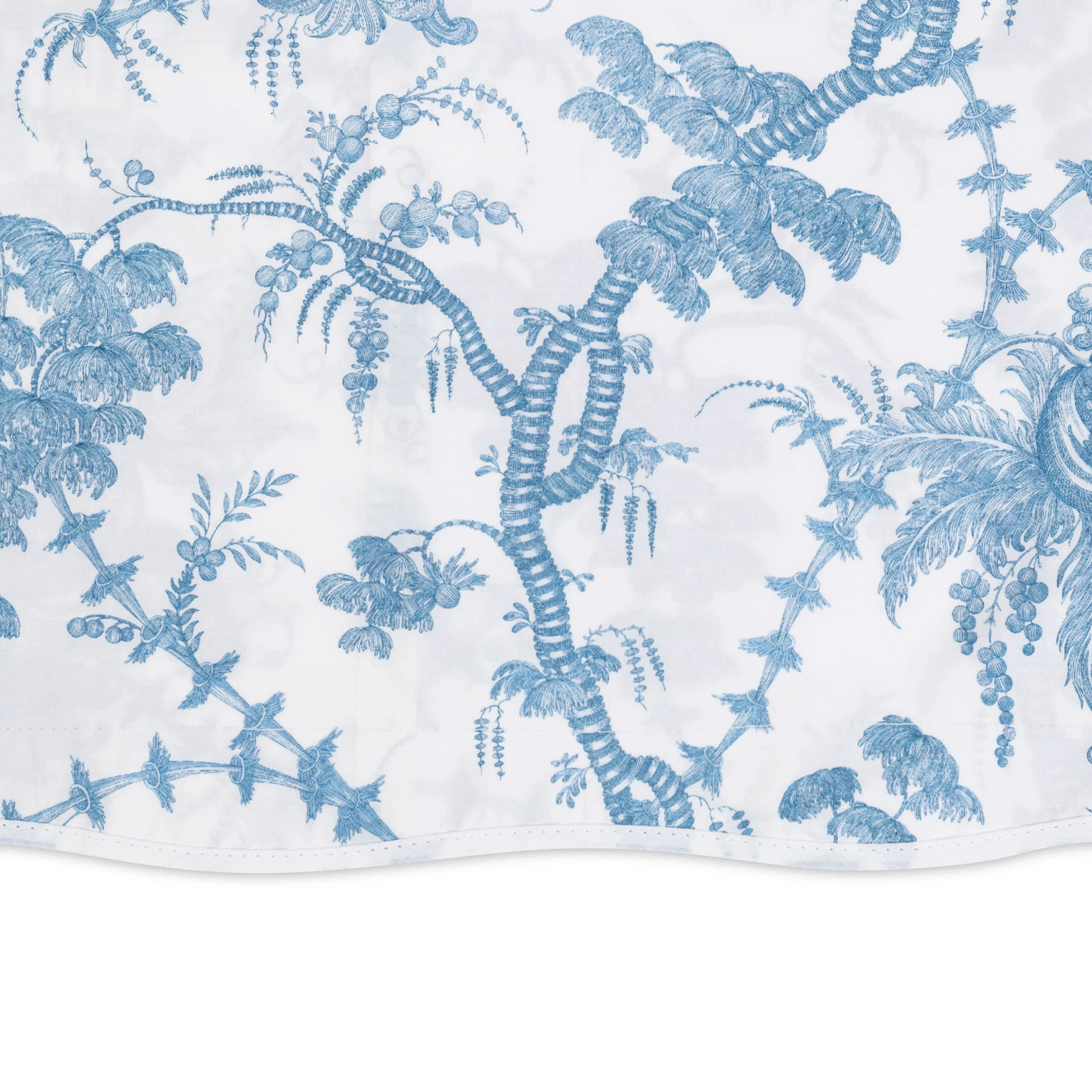 Schumacher’s San Cristobal print is a faithful rendition of an elaborately detailed 18th-century toile. Here it’s replicated on Egyptian cotton percale with an impressive 500-thread count, which ensures that this quilt feels as luxurious as it looks. The graceful scalloped and taped edges add to the overall elegance. All Matouk fabrics are OEKO-TEX Standard 100 certified, meaning they are safe for you and for the planet.Â