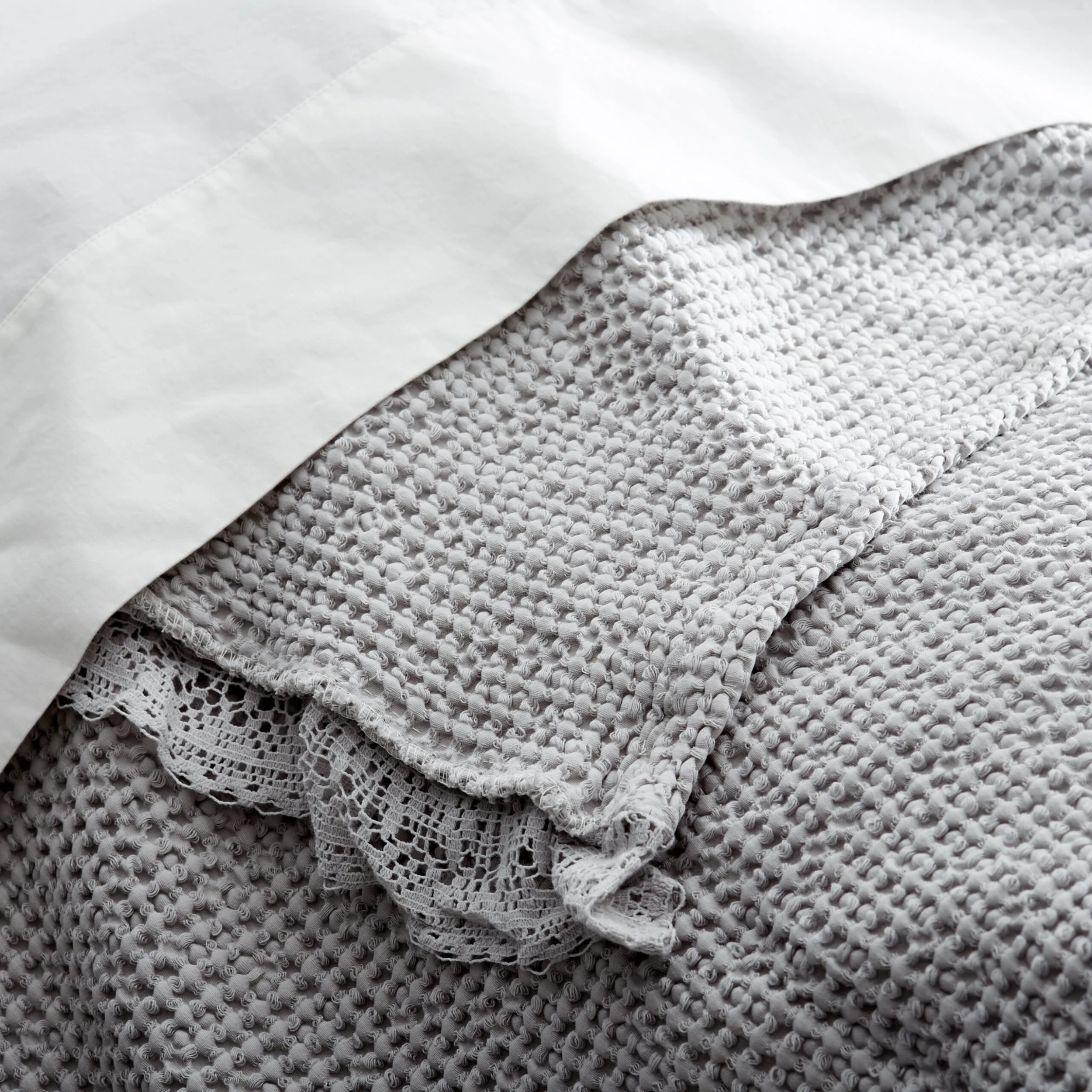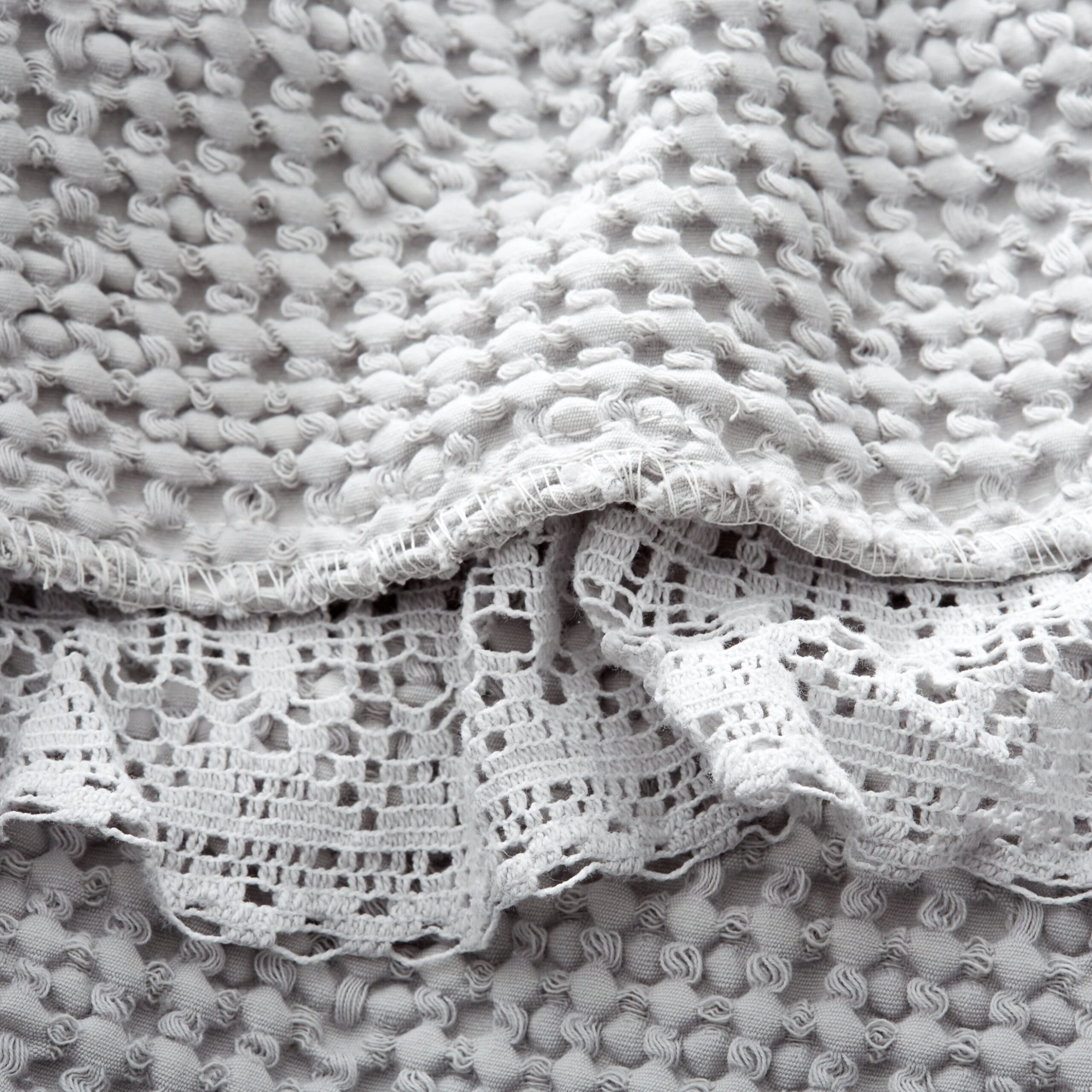 We love how this cotton coverlet’s soft gray hue accentuates its wonderful texture, while its embroidered lace border provides a charming finishing touch.