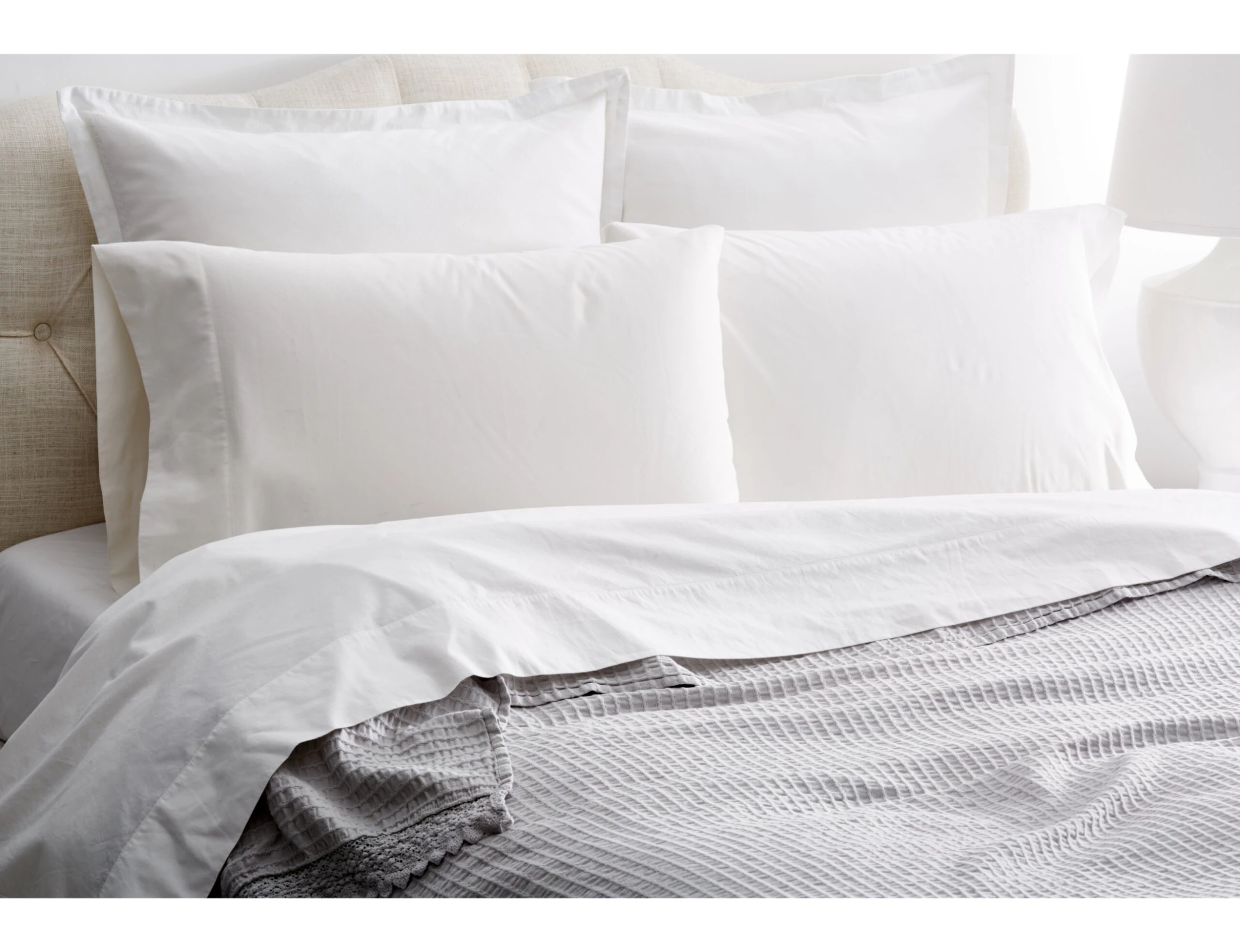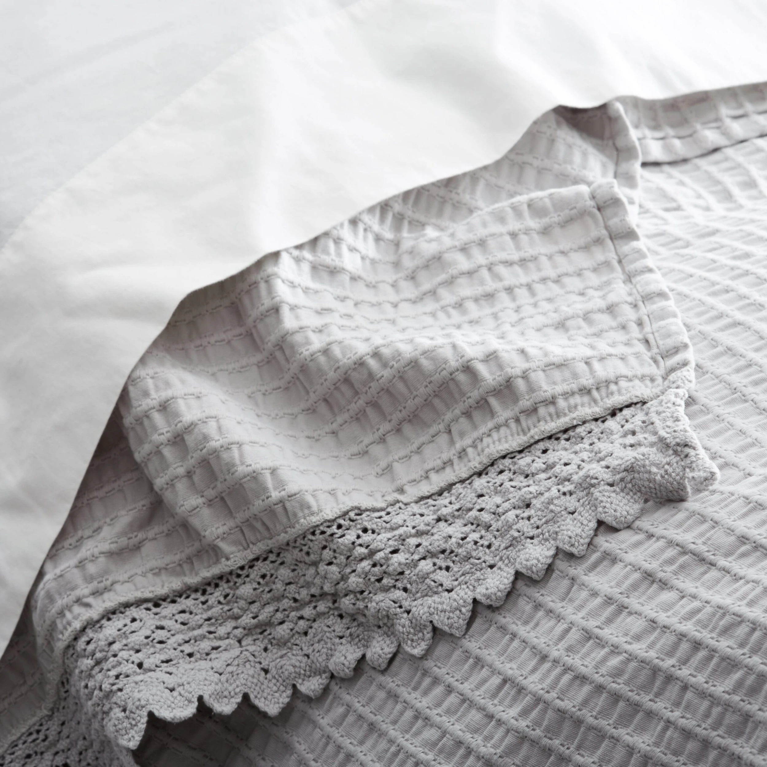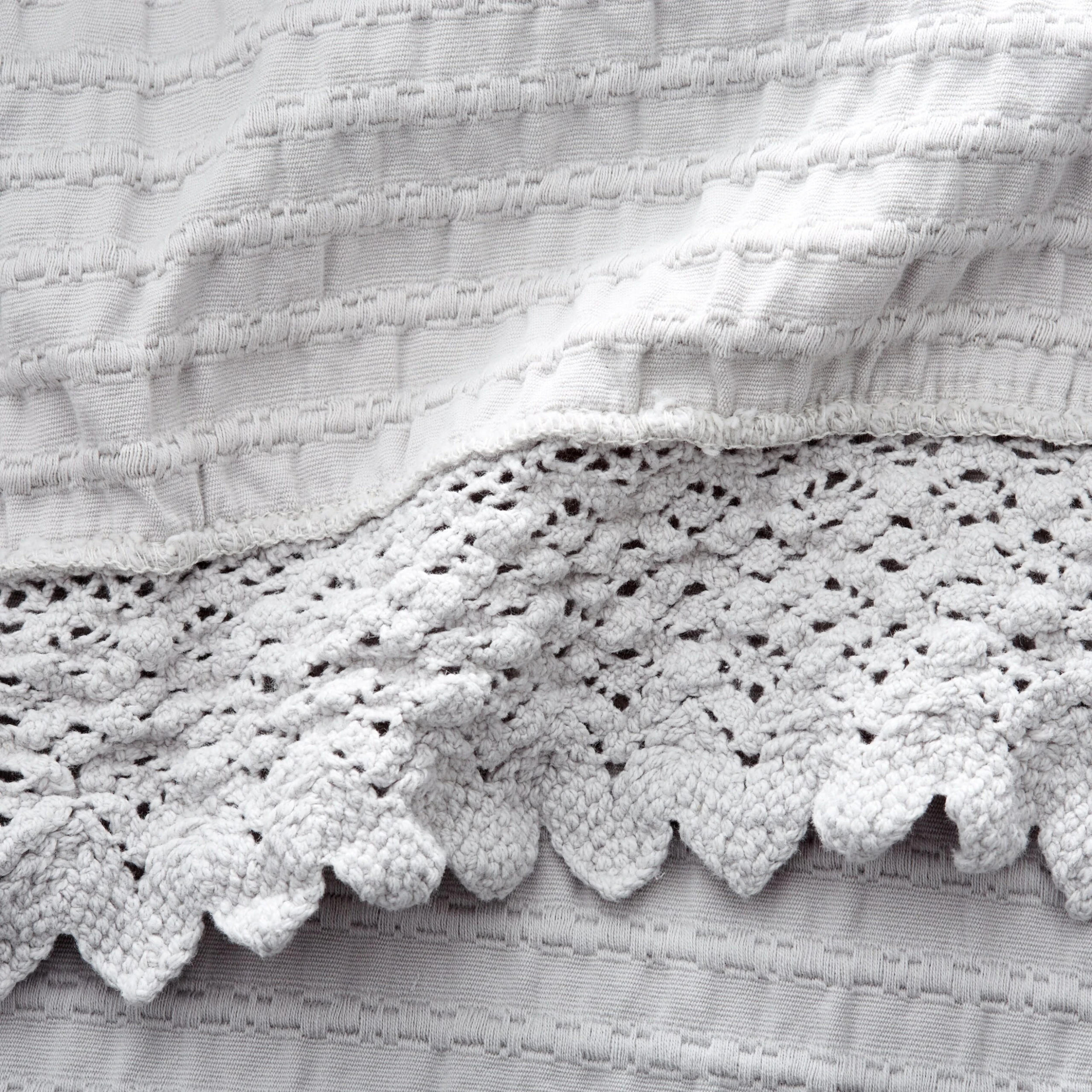 We love how this cotton coverlet’s soft gray hue accentuates its wonderful embroidered texture, while its scalloped lace border provides a charming finishing touch.