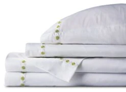Woven in Italy of fine Egyptian cotton sateen, this silky-soft sheet set is finished with lime-and-white embroidered dots on the hems of the flat sheet and pillowcases. The fitted sheet has a 17″ gusset.
