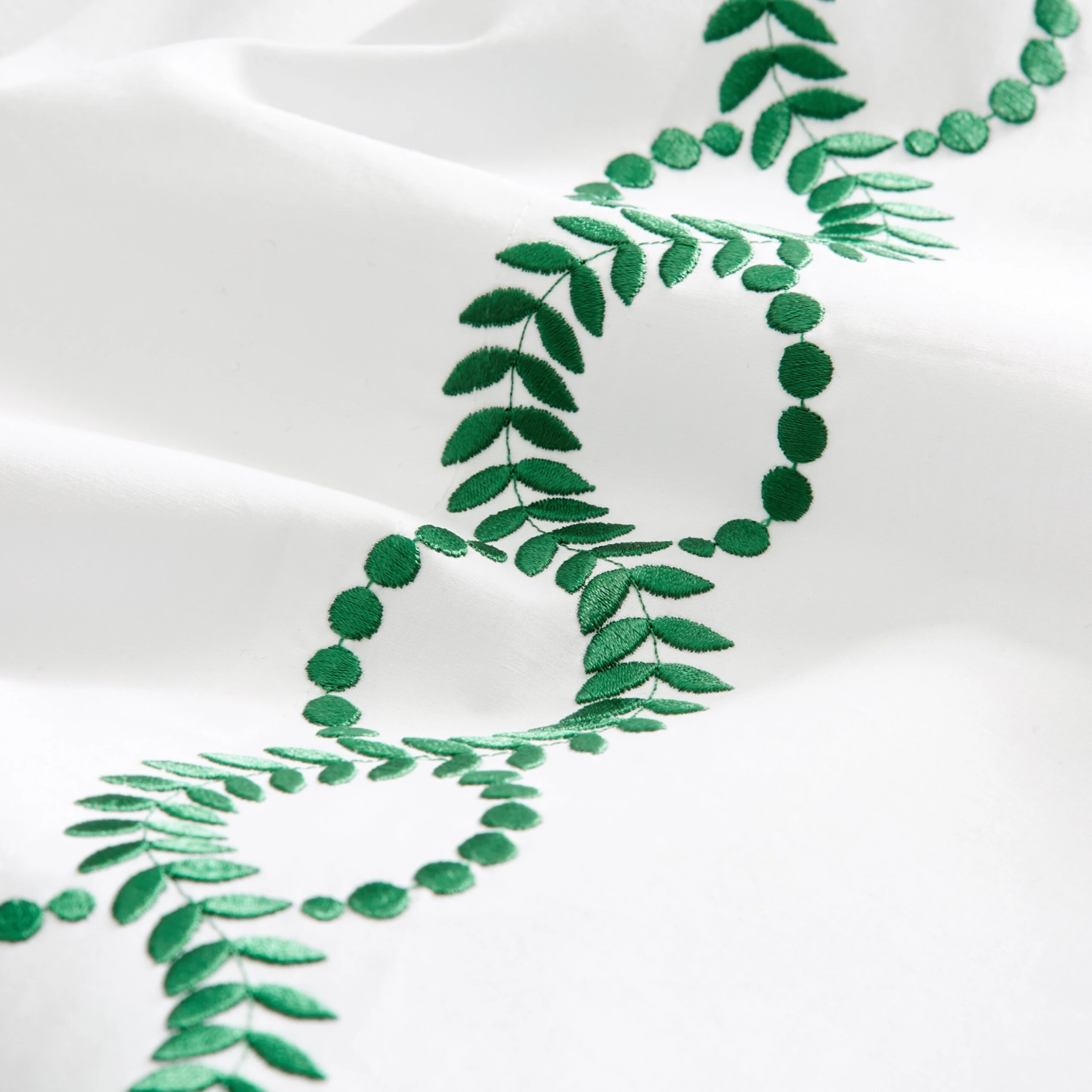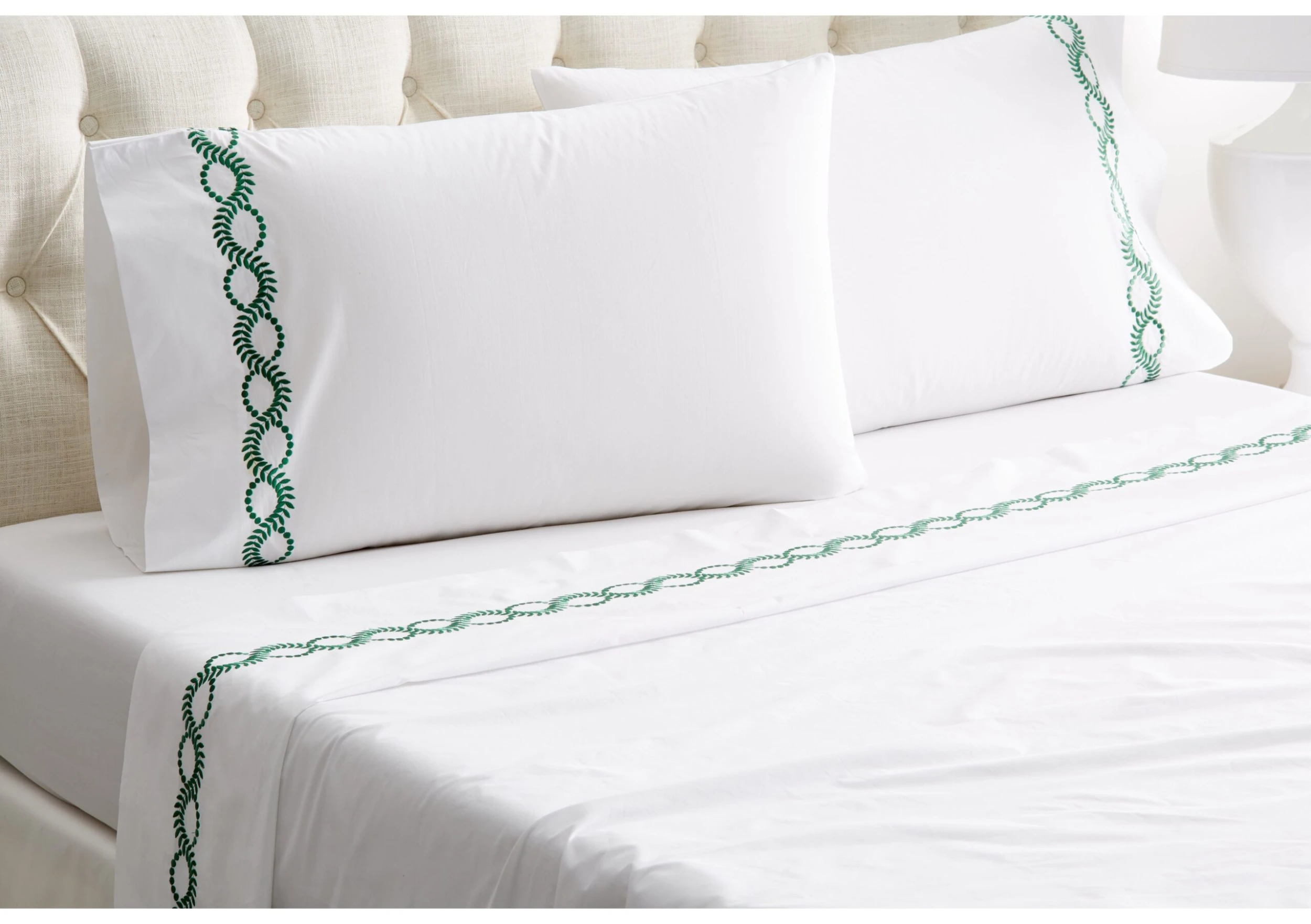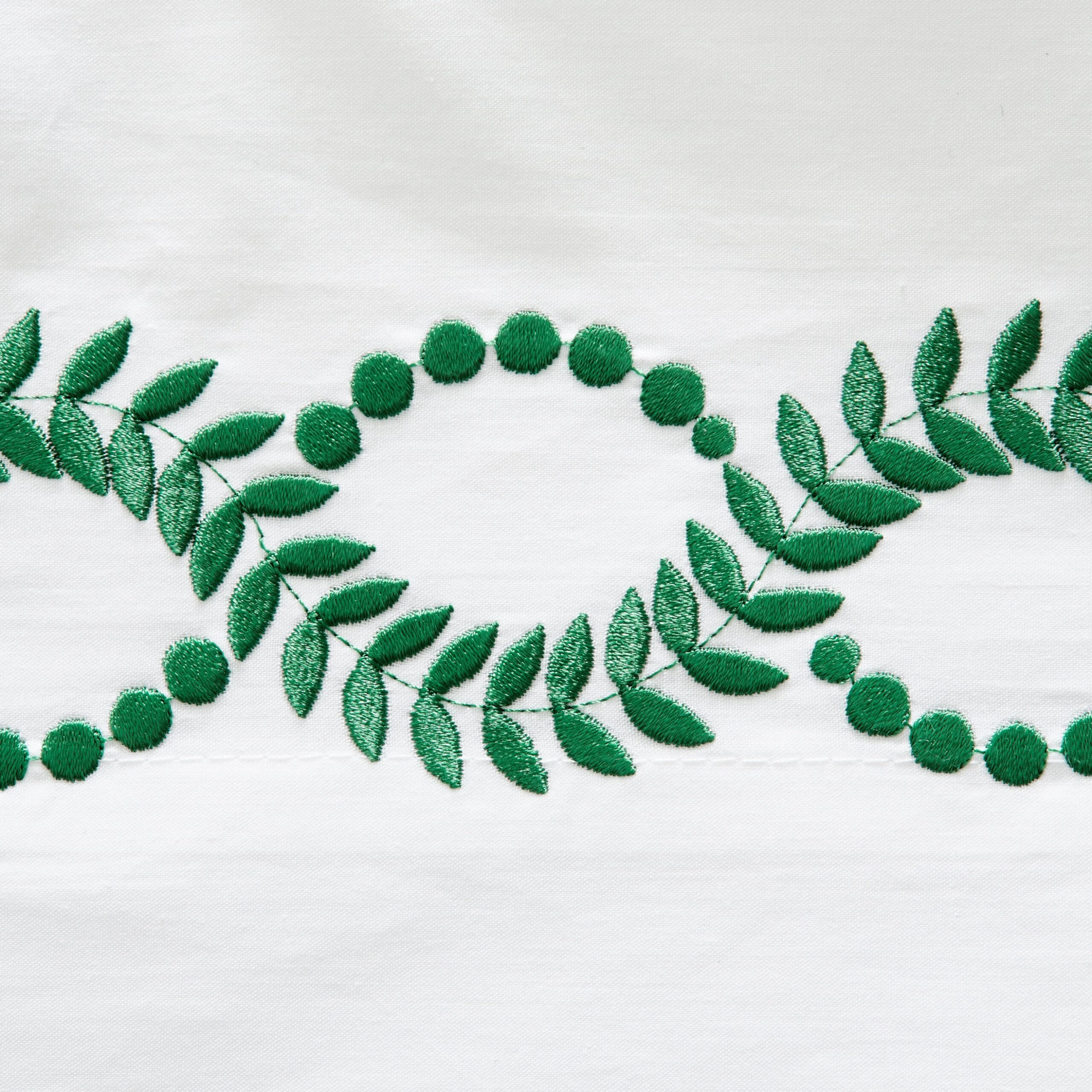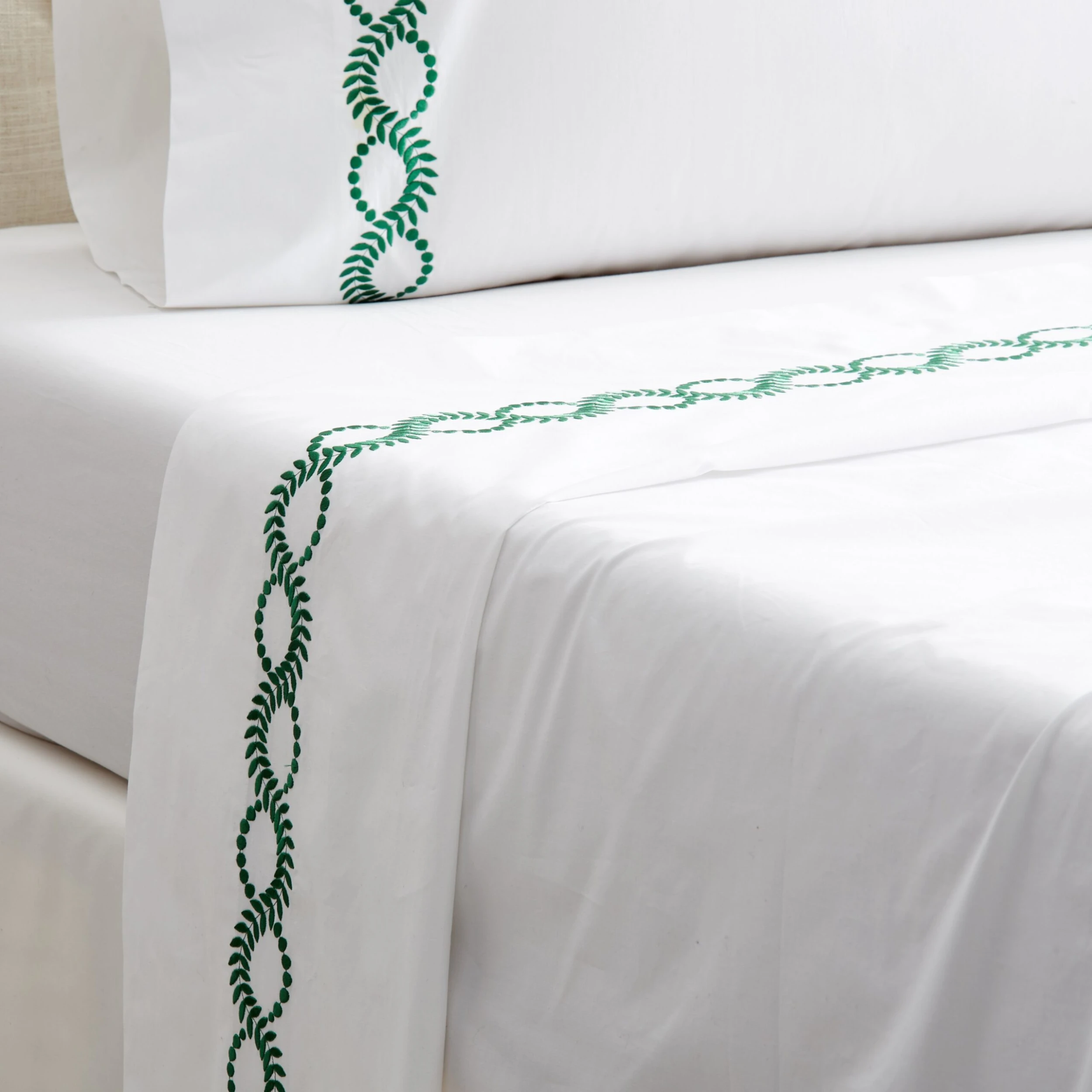 Exclusive to One Kings Lane: Embroidered vine motifs add a pop of color and a fanciful finishing touch to this exquisite Egyptian cotton percale sheet set, woven in Italy and artfully embroidered in the USA.